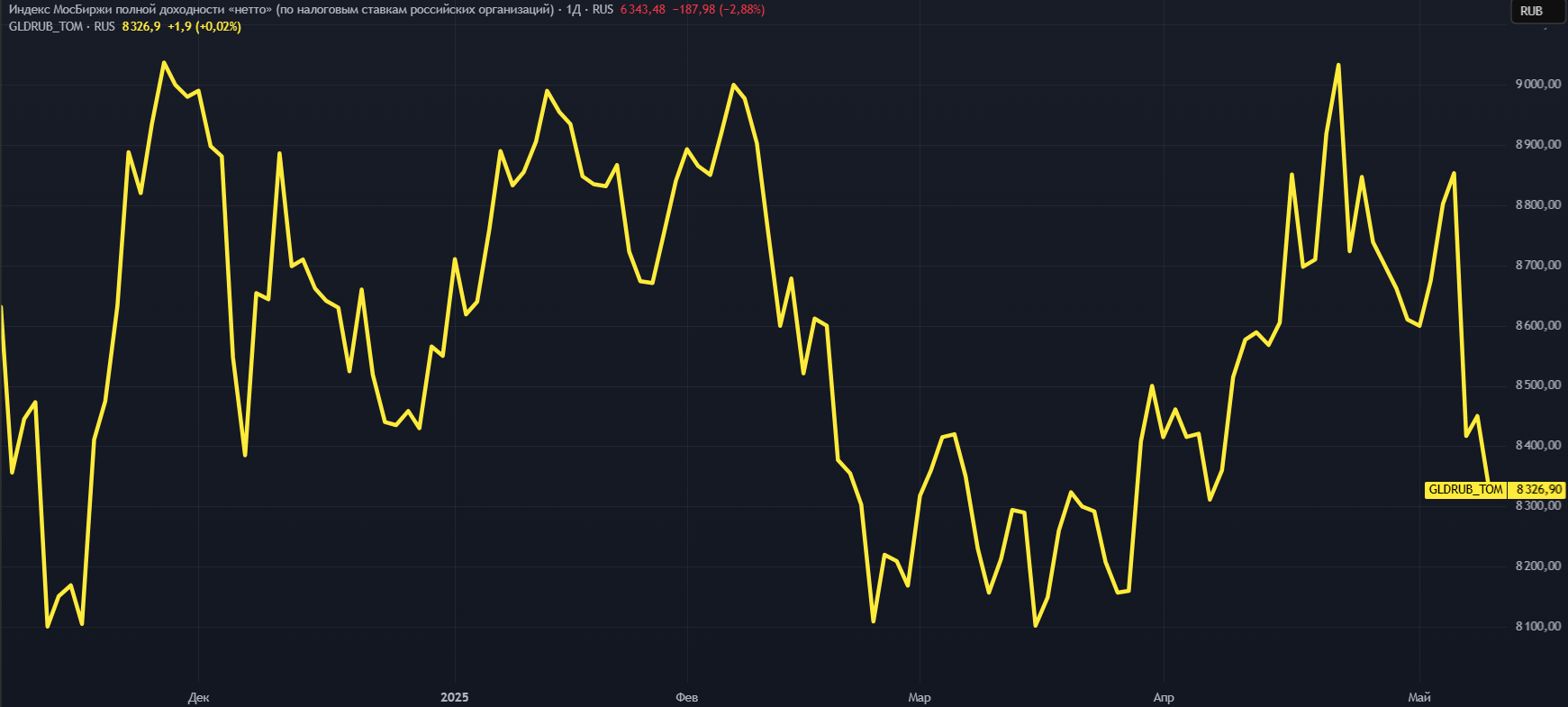 Для фиксации результатов данного финансового инструмента было взято GLDRUB_TOM - так называемое биржевое золото.
