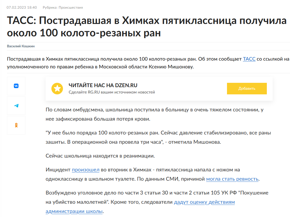 11 dekcho Доколе? 2 года назад Пяти(КАРЛ!)классница? Что вообще происходит? https://rg.ru/2023/02/07/tass-postradavshaia-v-himkah-piatiklassnica-poluchila-okolo-100-koloto-rezanyh-ran.html?utm_source=yxnews&utm_medium=desktop Новости Происшествие Нападение Школьницы Школа Конфликт Скриншот Негатив 2 Ещё 0