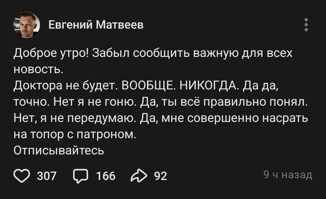 0 RussianCaliber Доктор Дью - всё... 10 месяцев назад Жаль, было весело... https://vk.com/wall72892581_226675 ВКонтакте ВКонтакте (ссылка) Доктор Дью Евгений Матвеев Скриншот 1 Ещё 0