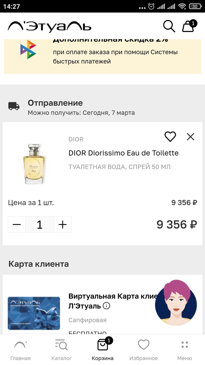 Заказала я маме ее любимую туалетную воду на день рождения, он у нее 9 марта. Дело было 5 марта, заказ тут же оплатила. На сайте еще заявлена акция, что при оплате через СБП действует скидка 2%- оплатила через СБП, но скидка не прошла. Ну ок, переживём. Подарок то нужен.