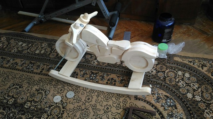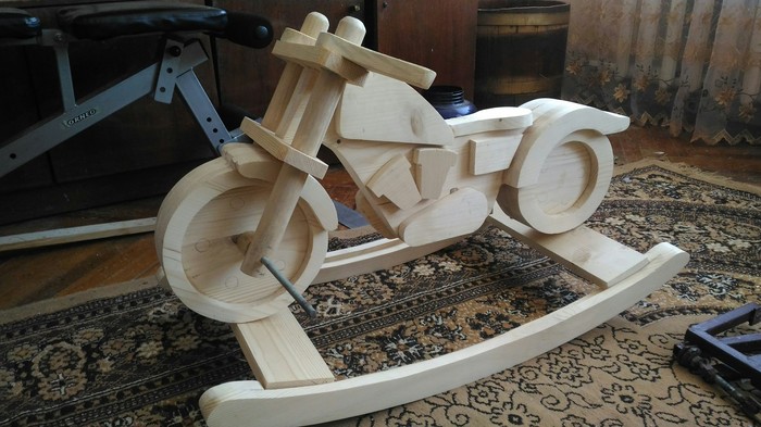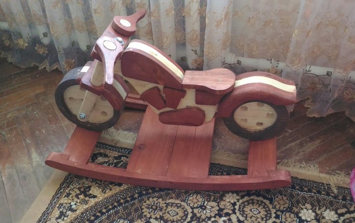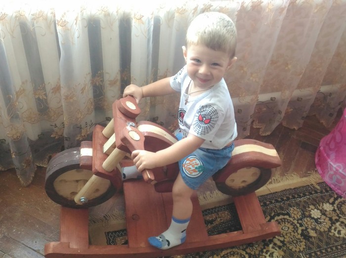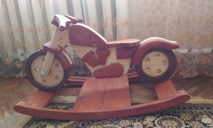 Как то раз, решил мой отец, сделать моему сыну качалку-"мотоцикл". Начало положил еще зимой и только сейчас доделал, творил в перерывах между работой.