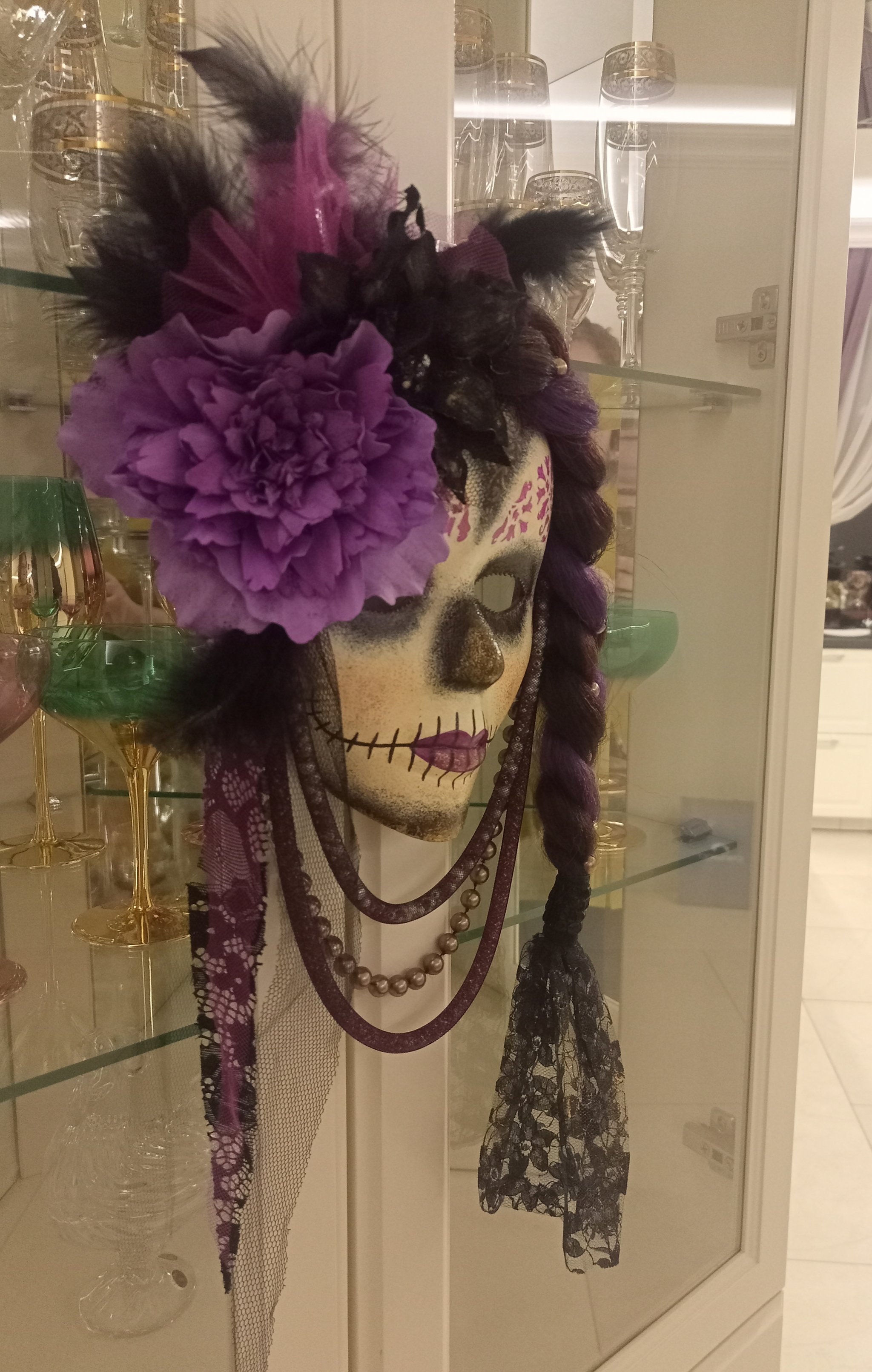 Был проект с маской по мотивам Диа де лос Муэртос, требовался совет по электричеству. Спасибо большое еще раз, советы пригодились, но использовала я их в паре других проектов. А маска так и зависла в шкафу. Периодически я ее доставала, крутила в руках, делала разные варианты цветов и элементов обрамления, прикладывала и так, и эдак...