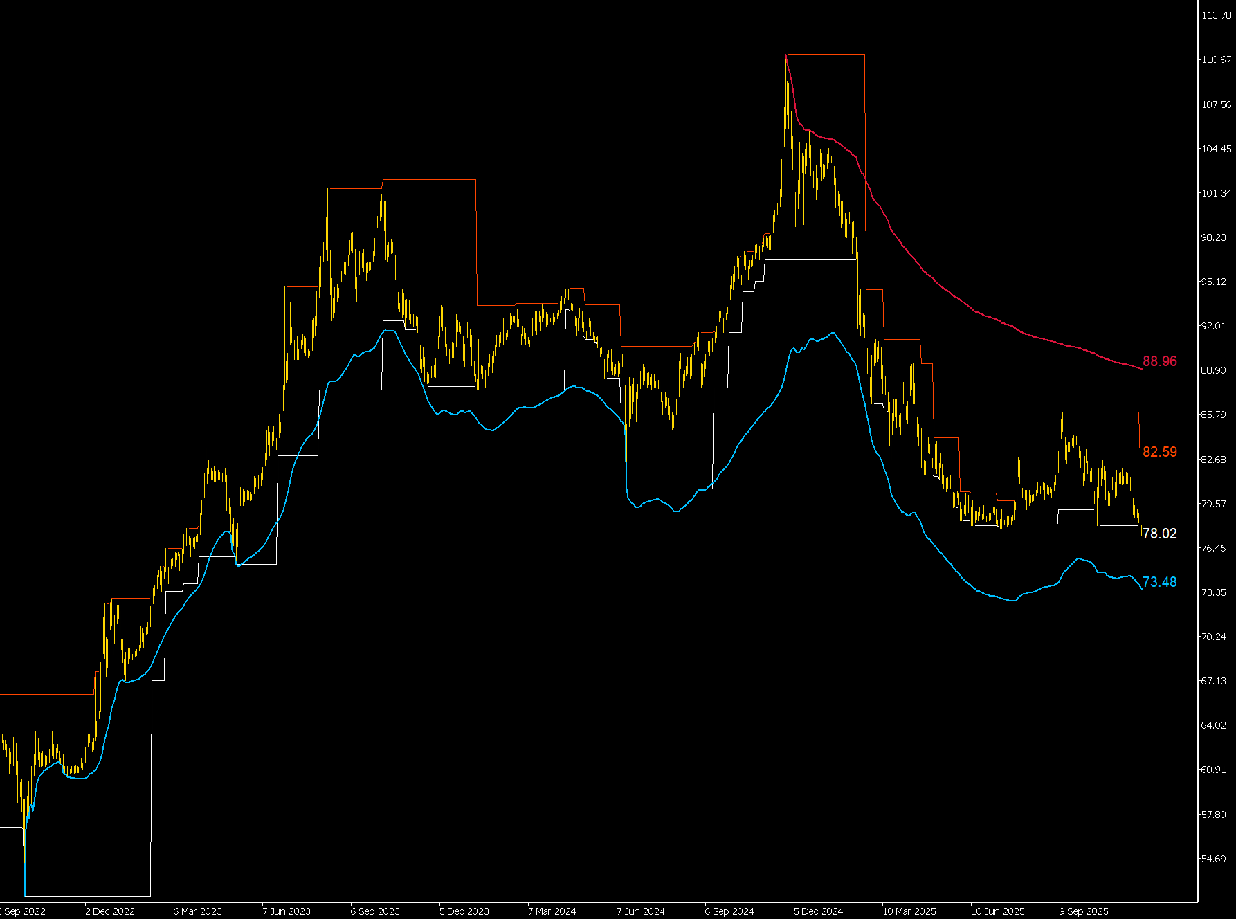 На графике нанесены динамические ценовые границы, который я использую для анализа потенциальных диапазонов движения цены. Так вот нижняя сейчас на 73,48.