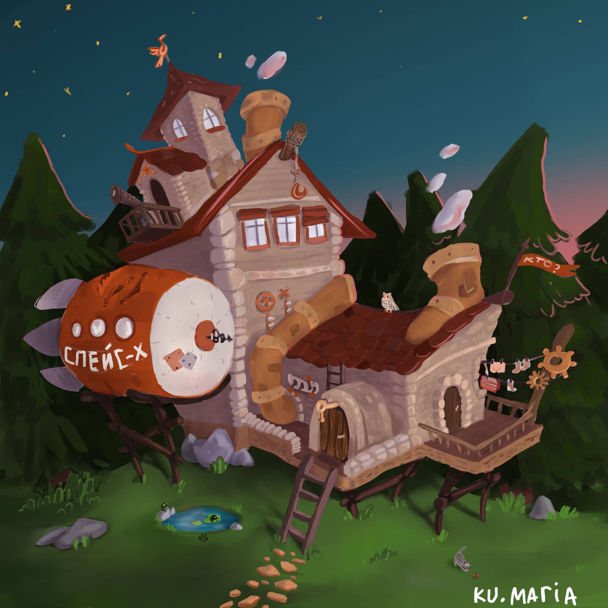 Как-то вечером, нарисовался у меня дом. Думается мне, что живет в нем одинокий инженер, который очень мечтает о небе и космосе.