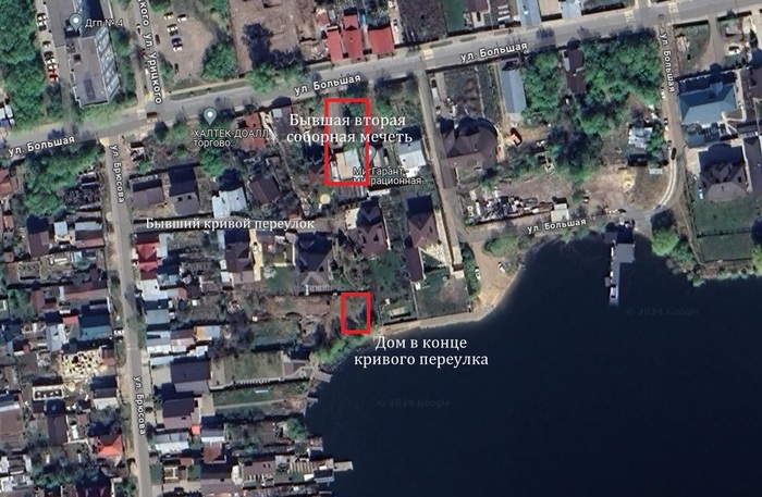 Информация о наводнении конечно же сбила с толку, но рассмотрение второй версии не остановилось. По иной логике получается, что московская улица, которая выводила прямо на заливные луга через кривой переулок скорее всего поворачивала на улицу Красная (Серп и Молот в наши дни) и вела вниз в поля, отсюда рождается гипотеза, что мечеть была всё-таки первая соборная, обращаясь к карте она действительно находилась неподалёку от кривого переулка, была закрыта в 1939 году. Бывшая Екатерининская Боголюбская церковь находилась не так далеко, как в первой версии и Жуковка около железнодорожной полосы, где был двухэтажный дом родственников Тупоноговых тоже была близко. И даже то, что в 1926 году (Паушкину было 5 лет) из-за сильного потопа дом Агафьи Пуриновой возможно был разобран, не отменяет предположения, что он мог находится в этой области, место прямо перед заливными лугами, однозначно выходящее окнами на Кремль и вокзал. На версию о нахождении переулка также намекает изображение на карте 1914 года озера «Кривое», рядом с улицей Красная, кривой переулок около кривого озера?