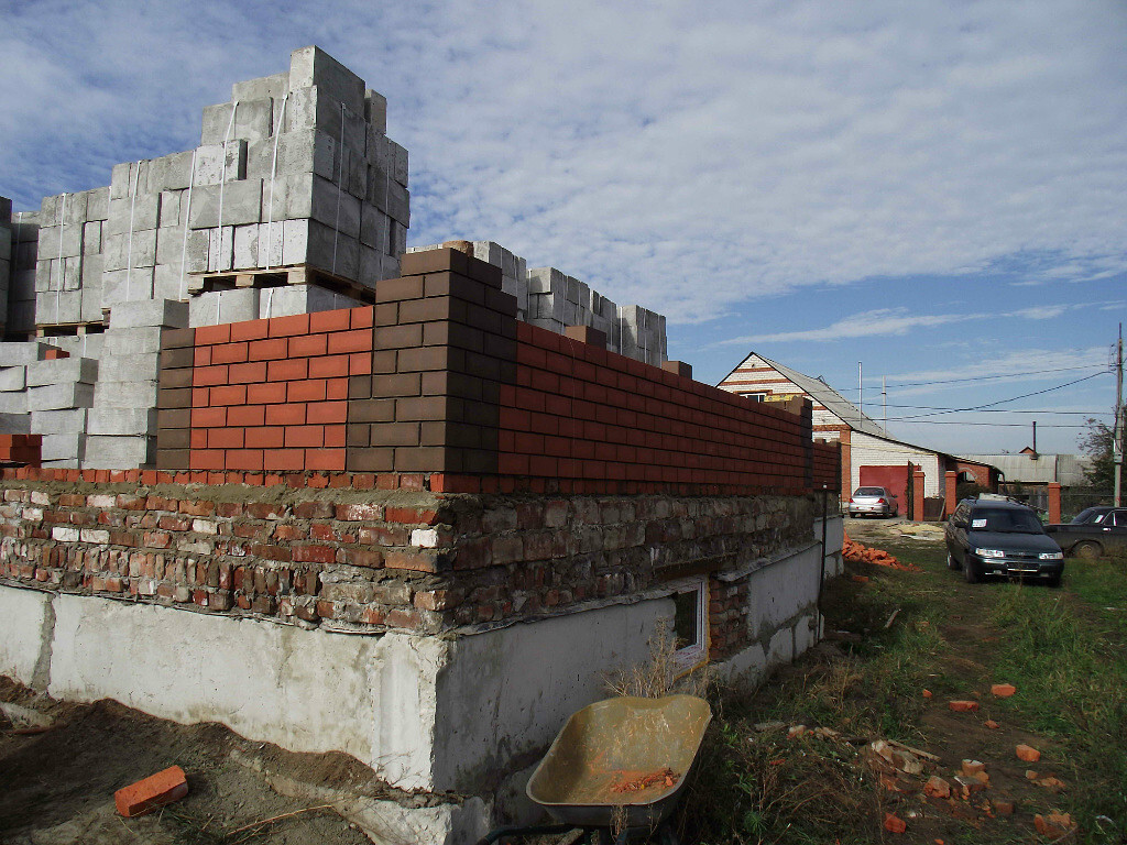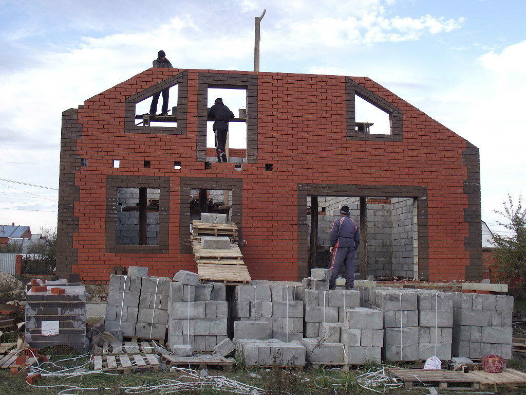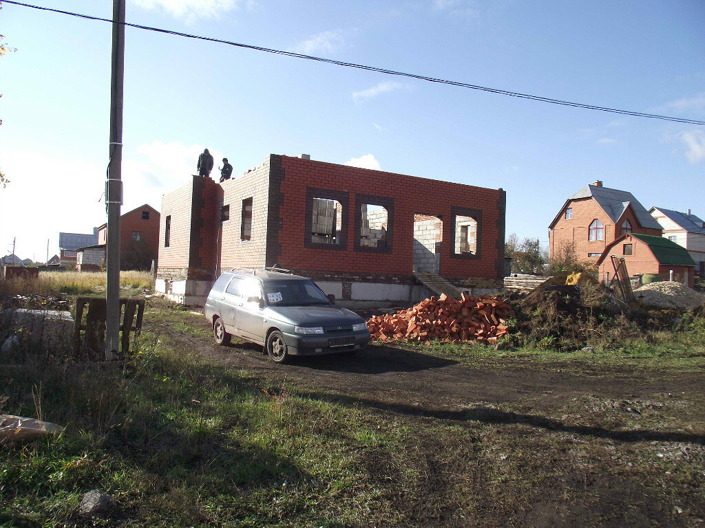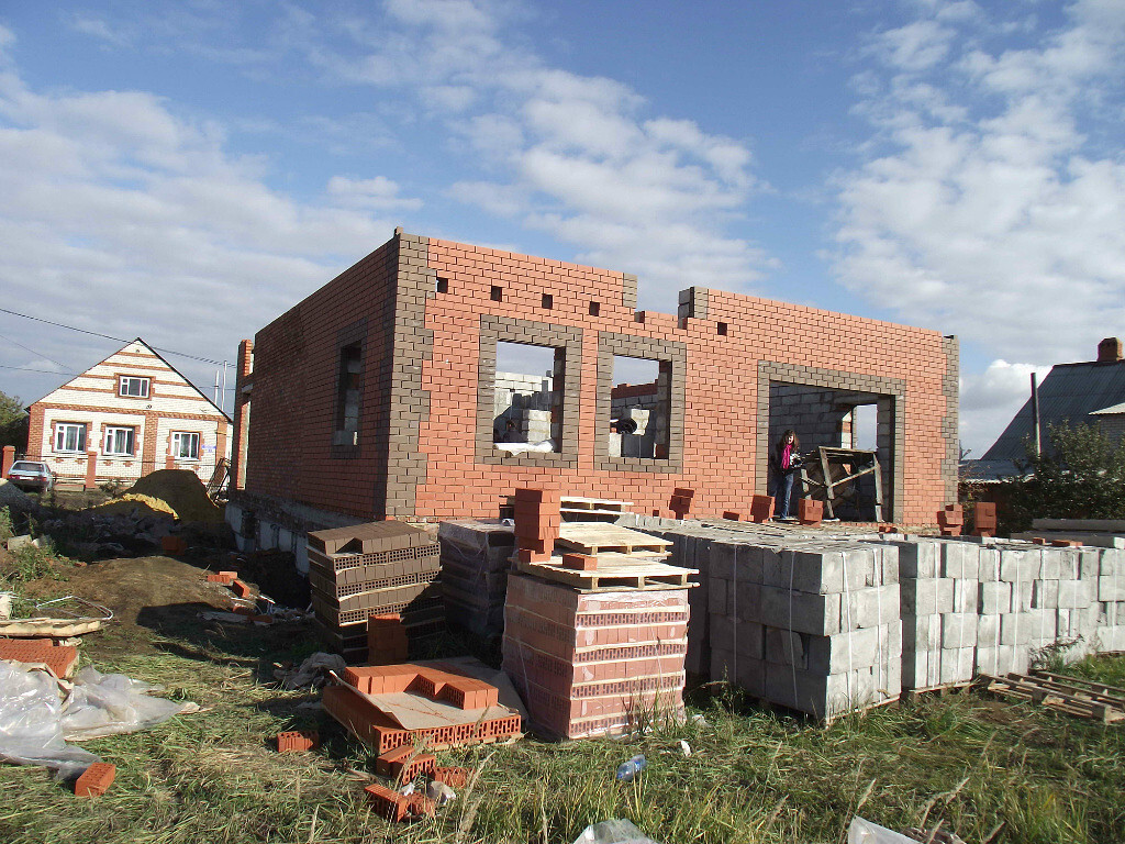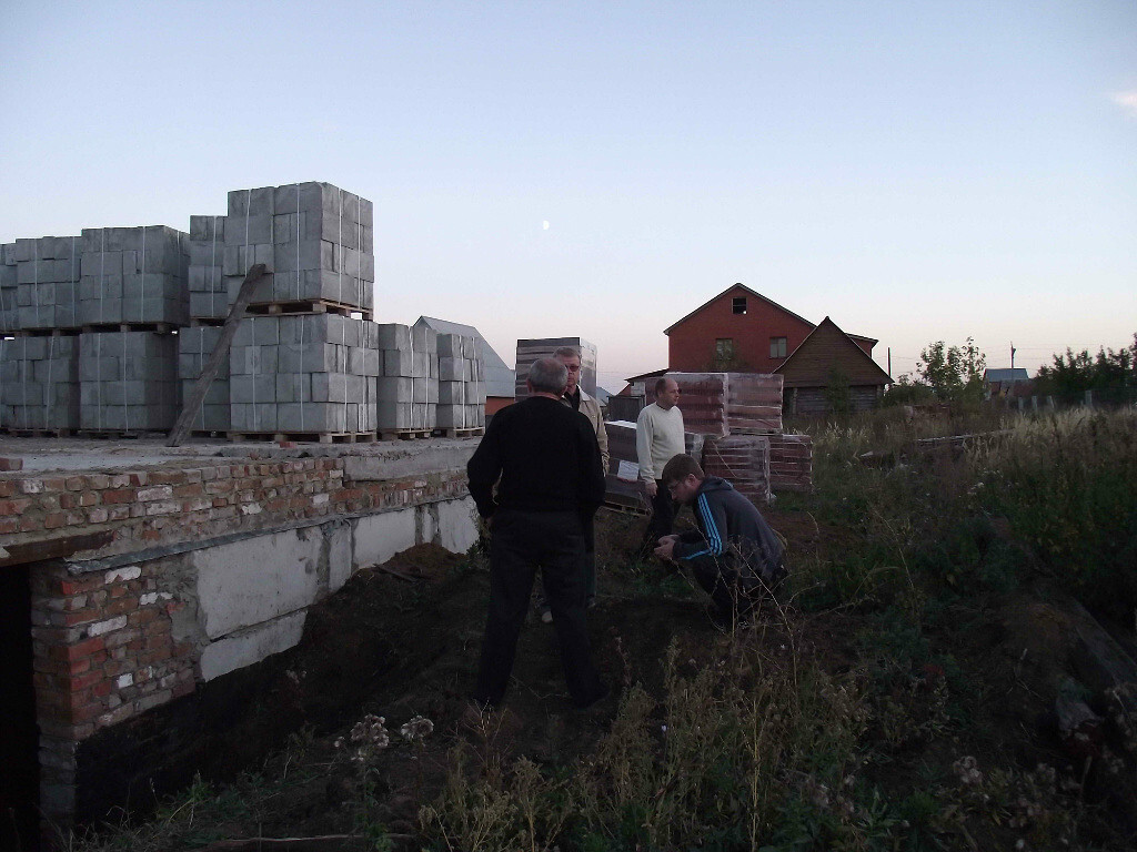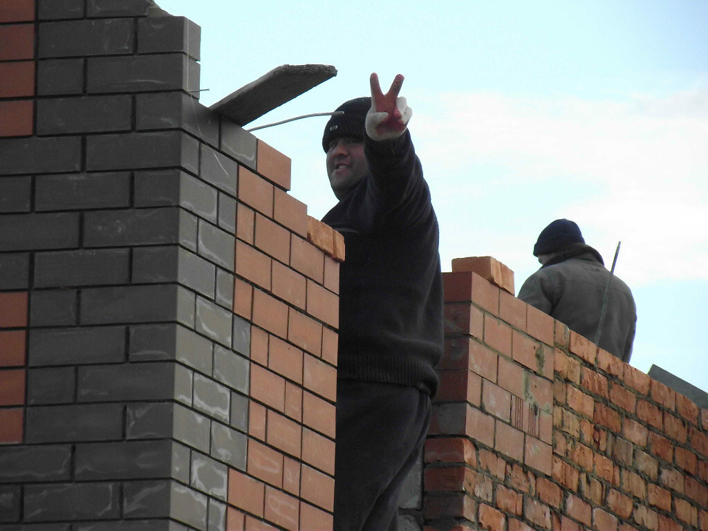 Самый главный специалист среднеазиатский приехал. Обсуждаем. Коричневые кирпичи на кладке это не что иное как планирование оконных проемов. Ходим вокруг дома и планируем. Мурад ходит ставит кирпичи, а я смотрю со стороны будет ли смотреться...