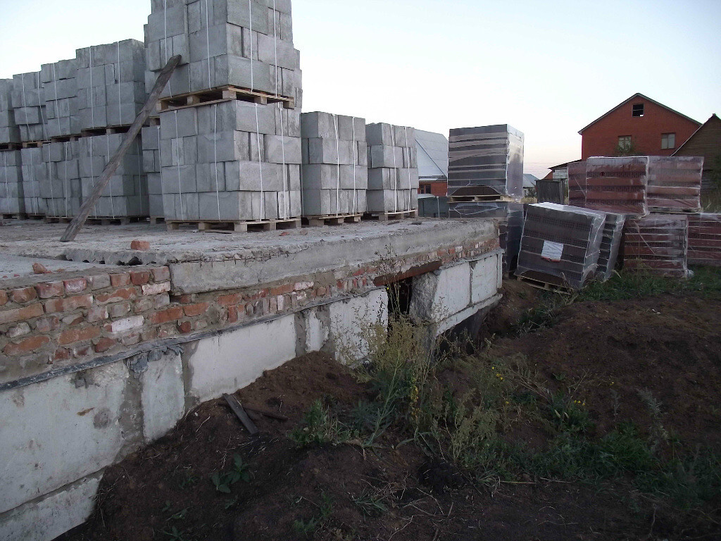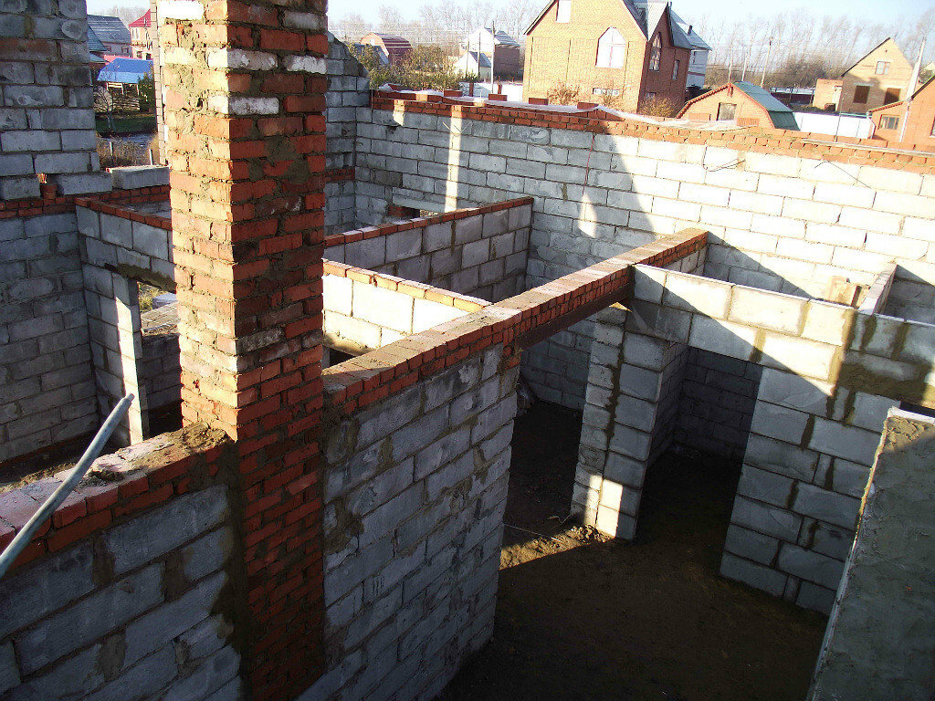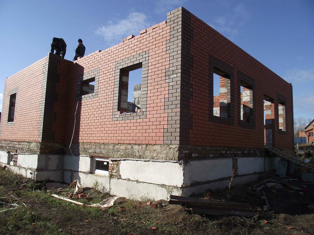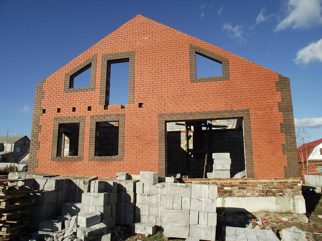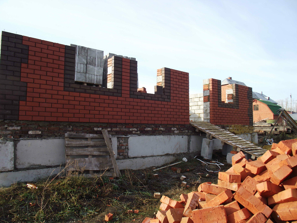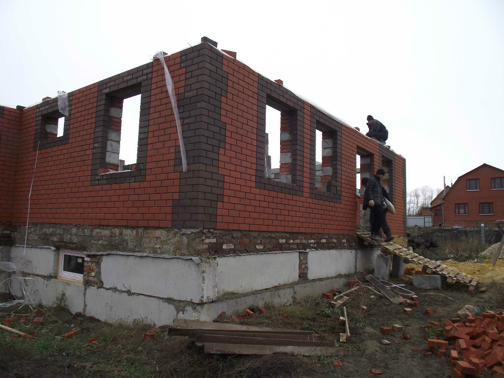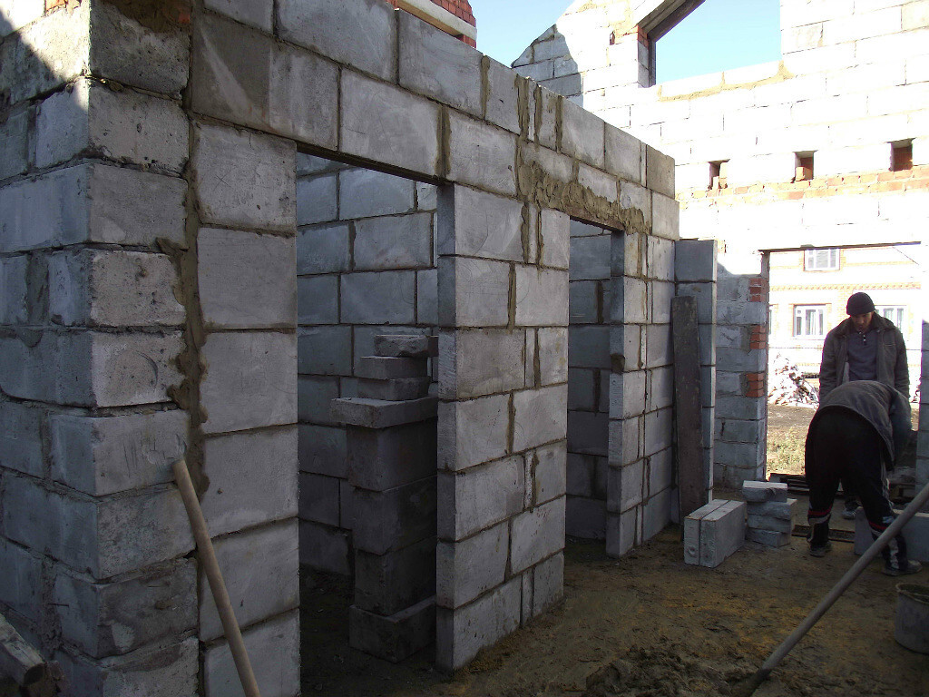 Самый главный специалист среднеазиатский приехал. Обсуждаем. Коричневые кирпичи на кладке это не что иное как планирование оконных проемов. Ходим вокруг дома и планируем. Мурад ходит ставит кирпичи, а я смотрю со стороны будет ли смотреться...
