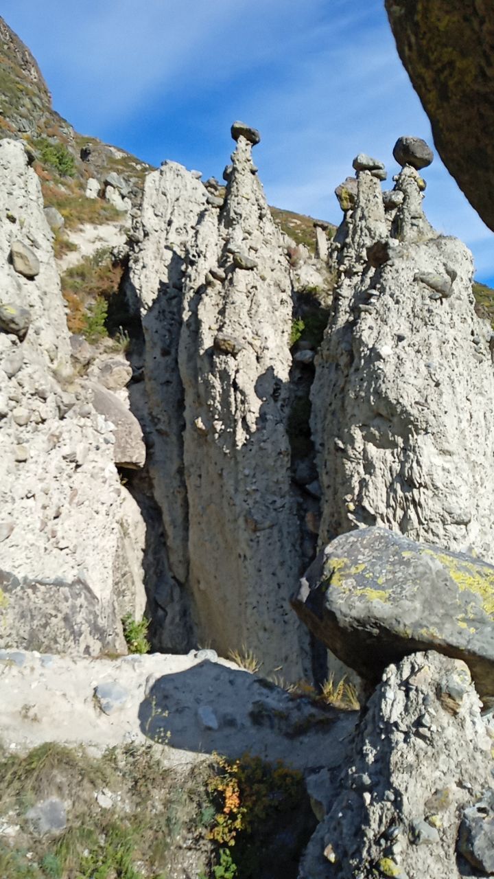 Первые природные скульптуры ещё не похожи на грибы, но похожи на формы которые я уже встречал на берегах реки Кемпендяйки. Склоны обильно заросли суккулентами.