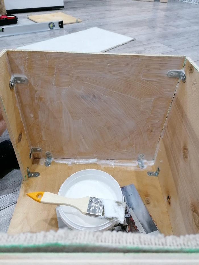 Огромной проблемой стало закрыть торцы фанеры. Изначально хотели прибить ковролин на степлер, но это оказалось очень некрасиво. ПВА торцы не держит, в итоге с этой задачей справился супер клей и космофен, после потраченных пары тюбиков суперклея и оценненых масштабов купили отечественный аналог космофена, оригинал за 500 брать не захотелось. Боялись что от клея останется запах и кот не подойдёт к такому дому но запах к счастью выветрился очень быстро. Кот залазил в ещё не достроенный дом как только мы от него отходили.