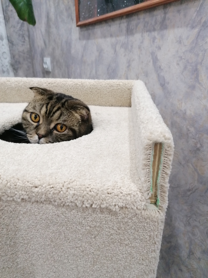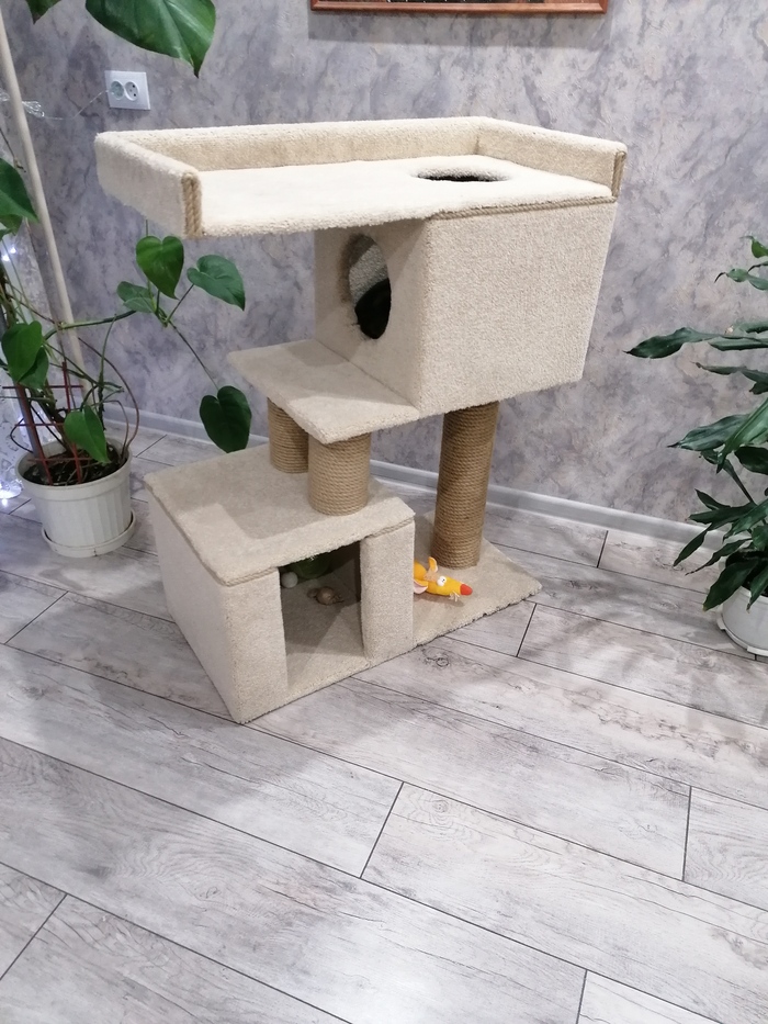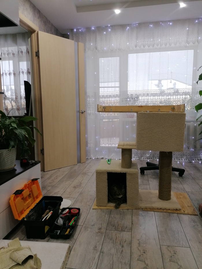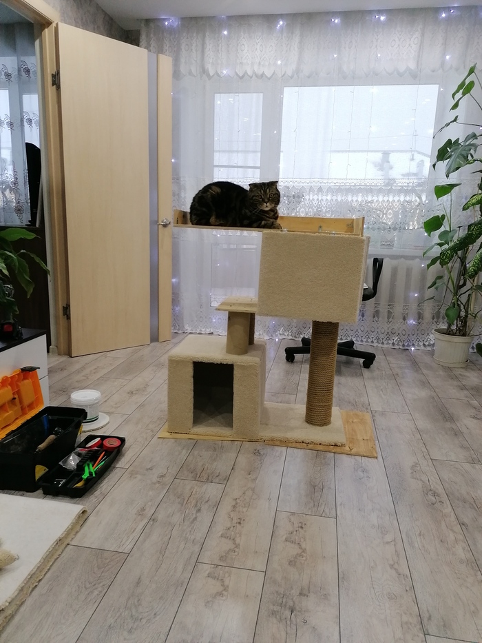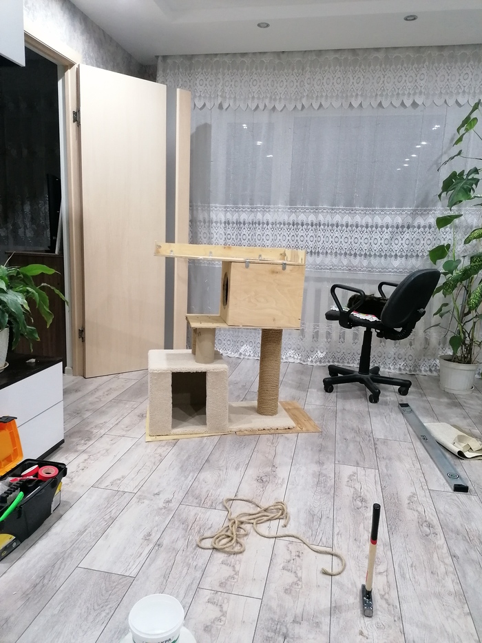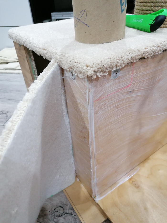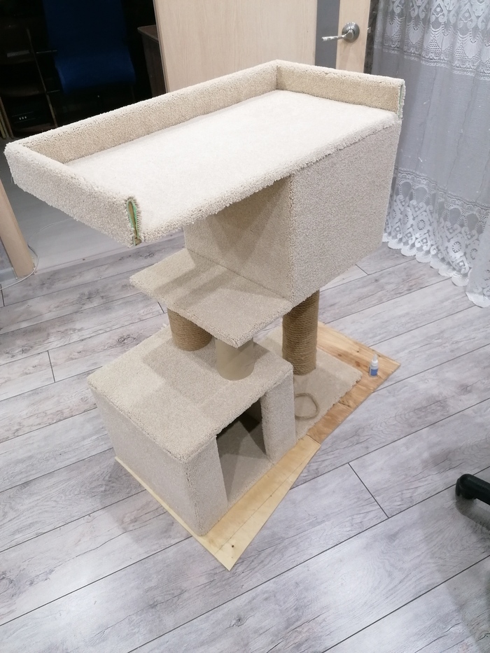 Получилось как то так. Когтеточки лучше сразу обмотать джутом, так проще хоть и не критично. И главный мой косяк это то что я не использовал угольник, а чертил только по линейке, очень много неровностей и щелей из-за этого получилось. Не повторяйте моей ошибки, хоть ковролином и скрылись почти все косяки но собирать тот ещё геморрой.