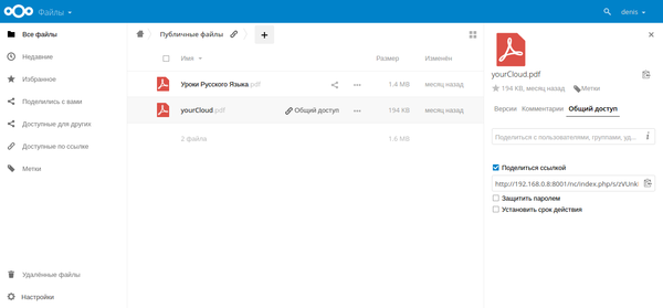 Нажмите на иконке с домиком вверху и вернитесь в корневой каталог файлов. Создайте новую папку и загрузите в неё несколько файлов. Нажмите на иконку «Поделиться» рядом с именем одного из файлов и поставьте галочку «Поделиться ссылкой». Теперь файл доступен по ссылке на любом устройстве в локальной сети.