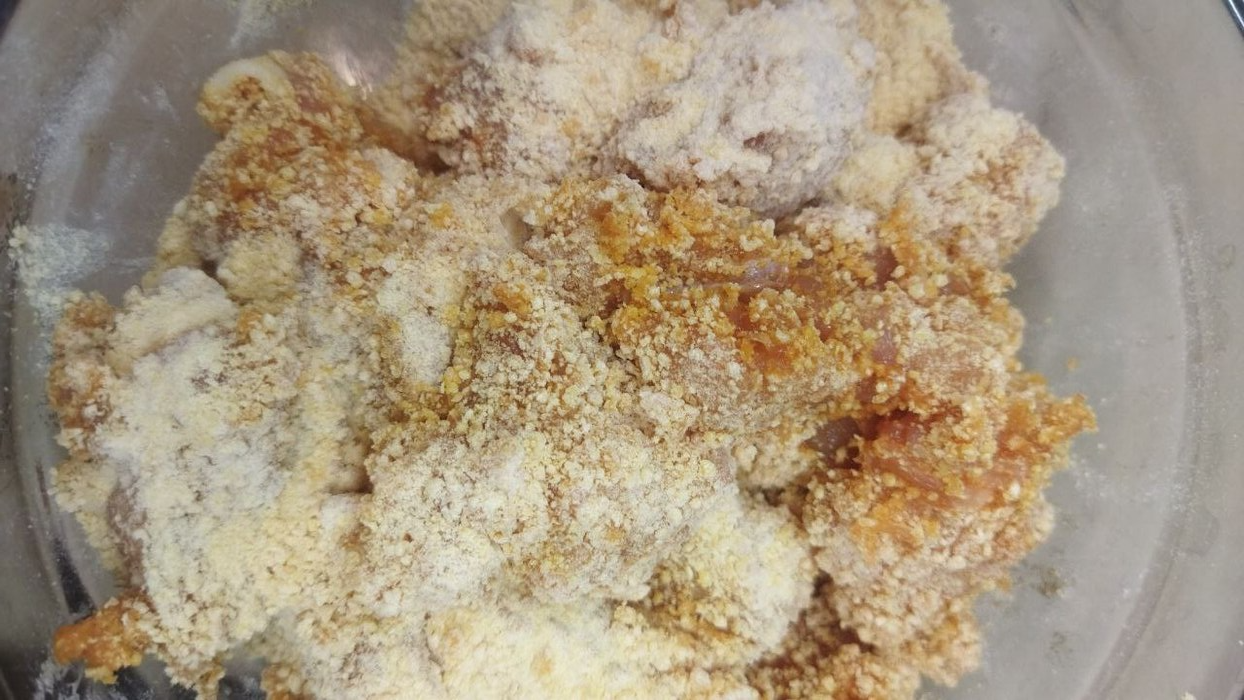 Обвалять курицу во взбитом вилкой яйце, далее в сухой смеси.