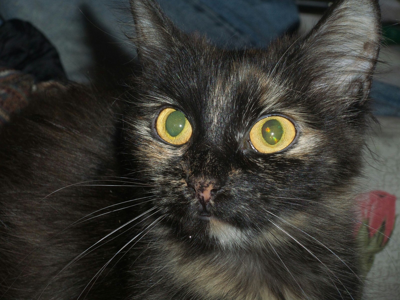 Девочки обычно трехцветные, очень активные, глаза большие, шерсть среднепушистая. Не сваливается и особо не линяет. Окрас чаще трехцветный, без выраженных пятен. Просто смесь трех цветов - коричневый, рыжий, белый. Не царапается и не кусается. Спокойно играет с фантиками, обожает лазер.