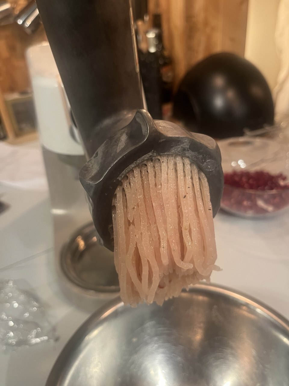 Все ингридиенты перемешиваю и отправляю в мяорубку. Насколько мне известно на профессиональных мясорубках три решетки и два ножа, то есть мясо фактически перерубается дважды. Поэтому подражая настоящим поварам кручу мясо сначала на крупной решетке, потом на мелкой. Так разрушается гораздо больше клеточных стенок и вытекающий (выпадающий?) оттуда гликоген делает фарш гораздо более липким. Потом начинаются скучные мероприятия: вымешивание и вызревание фарша. Хорошо вымешиваю фарш, выбиваю его и оставляю на полчасика полежать, чтоб я успел вымыть мясорубку пока там все не засохло он осознал свое положение и впредь был более податлив.