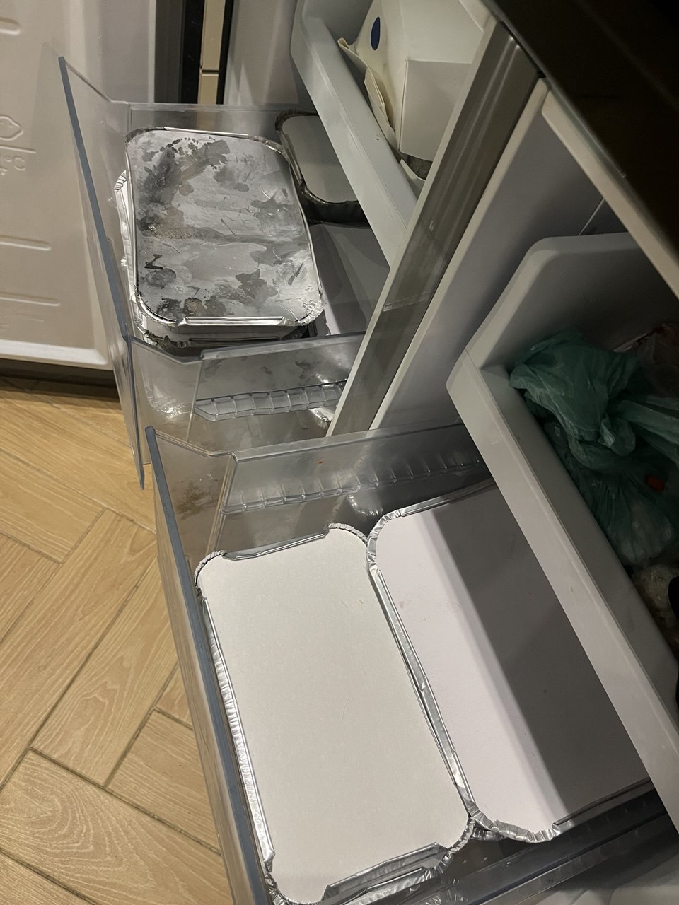 Потом наливаю в миску воды, смачиваю руки и раскидываю фарш на лотки, открываю холодильник, чтоб попить, а там это приобретение малоизвестного акционера