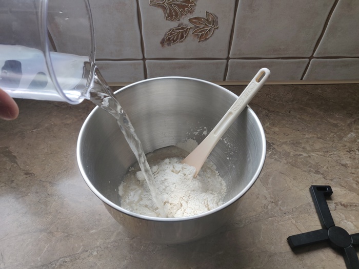 2. 300 г муки и 250 г воды смешаем в деже, и так же отставим на пол часа под полотенце для аутолиза