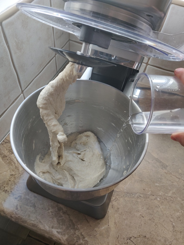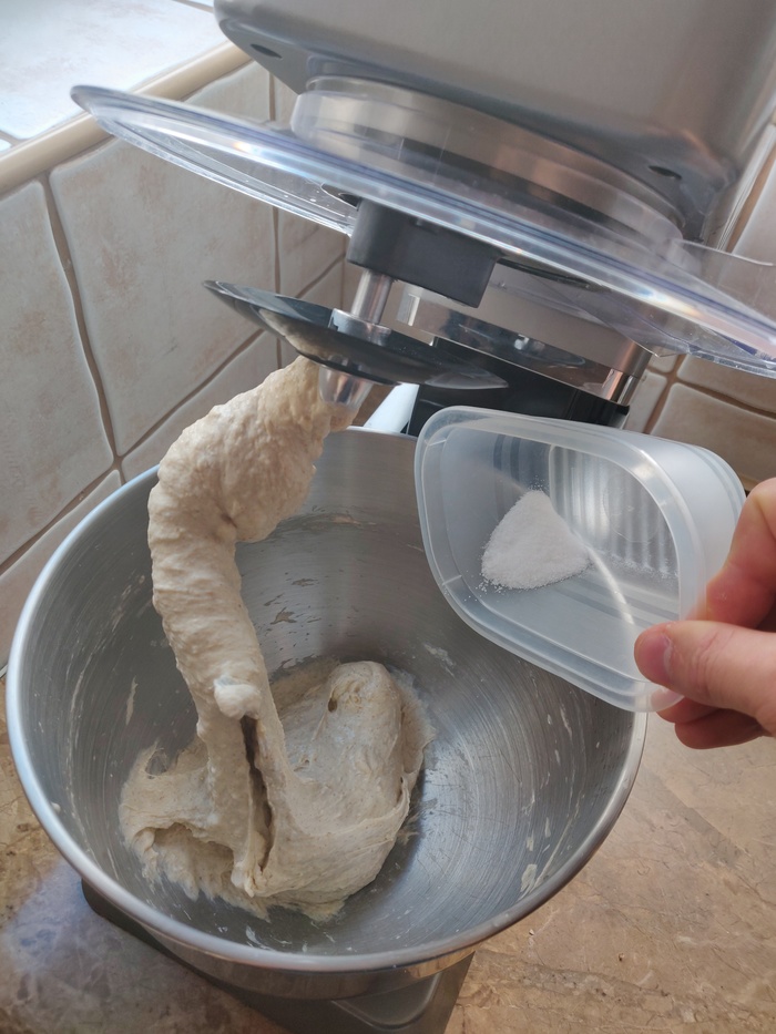 4. Добавляем поэтапно соль, оставшиеся 50 г воды и 100 г муки, вымешиваем на второй скорости до момента полной активации глютена (около 6 мин). Оставляем тесто отдохнуть на пол часа