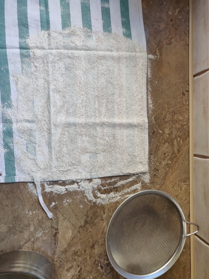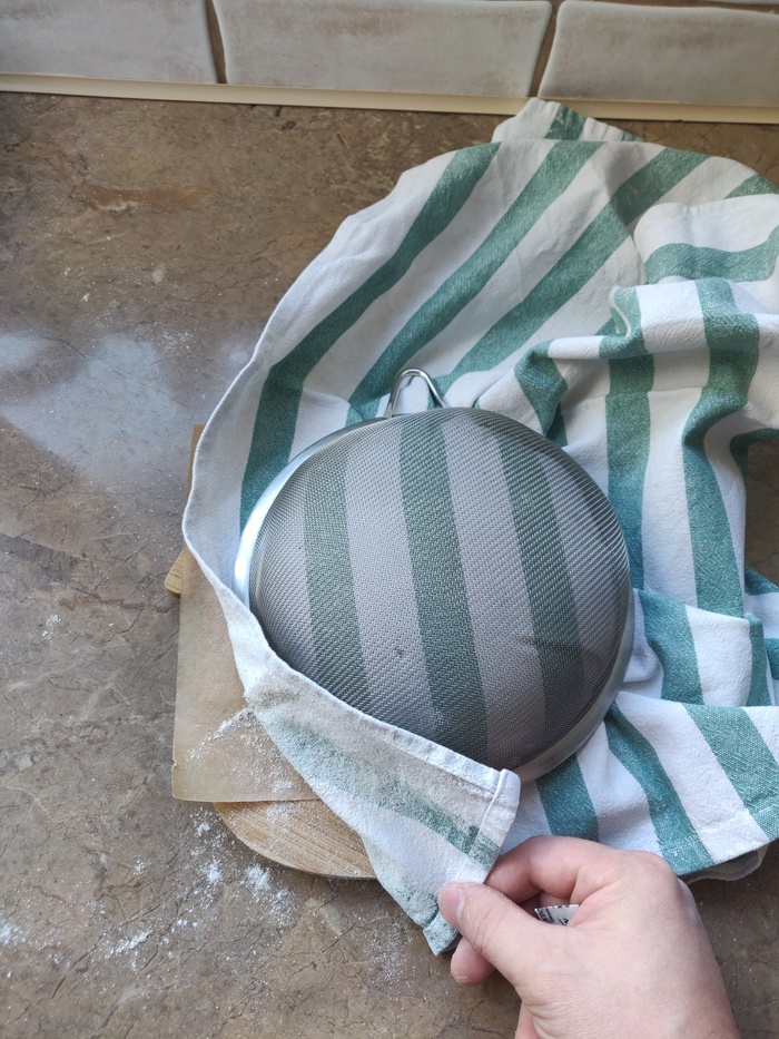 6. После холодильника дадим тесту время набрать температуру пол часа и аккуратно, чтобы не выдавливать пузырики воздуха, формируем две заготовки, укладываем на натертое мукой полотенце и помещаем в форму/корзинку. Я использую сито, т.к. пропускает воздух и тесто не приклеивается к ткани