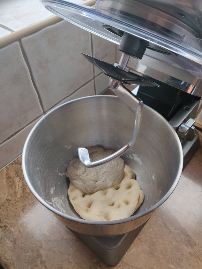 3. Добавляем в дежу премикс закваски, смешиваем около 2 мин на первой скорости и 1 мин на второй