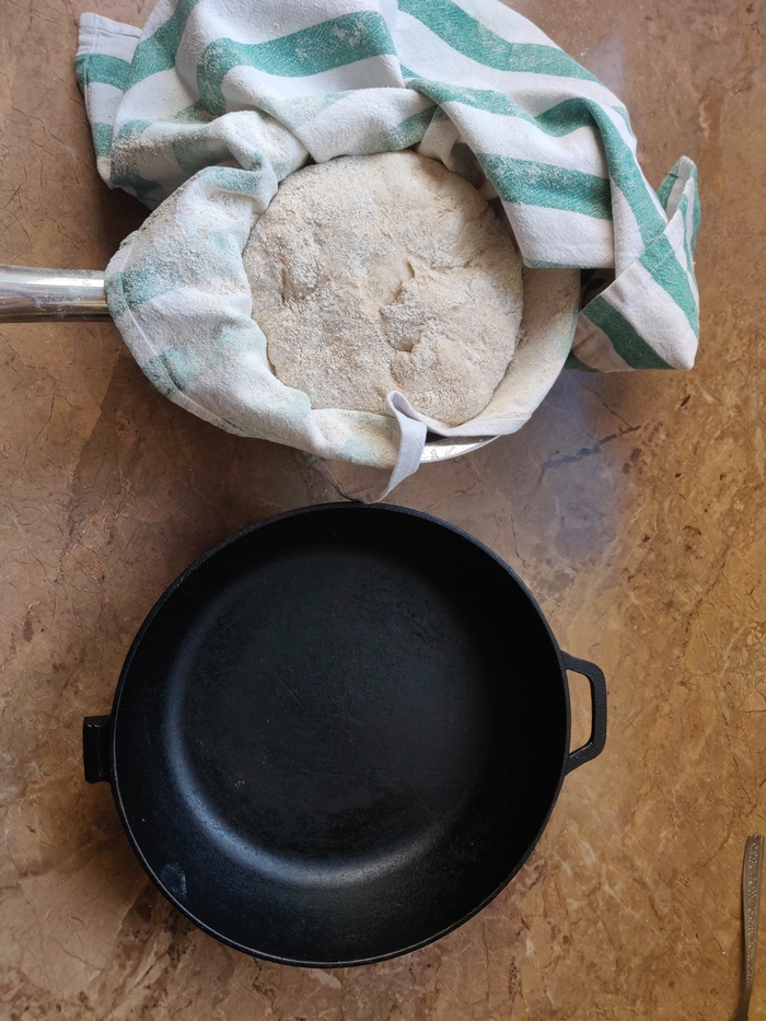 Чтобы аккуратно перевернуть корзинку можно накрыть сверху пергаментом и доской. Сделать алле-оп, снять полотенце, надрезать (необязательно) и сдвинуть пергамент в сковороду.