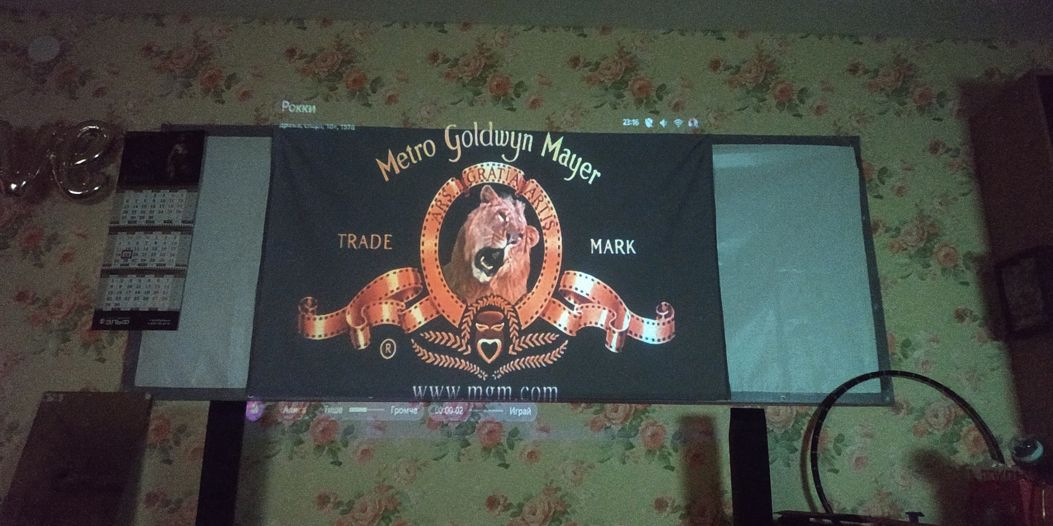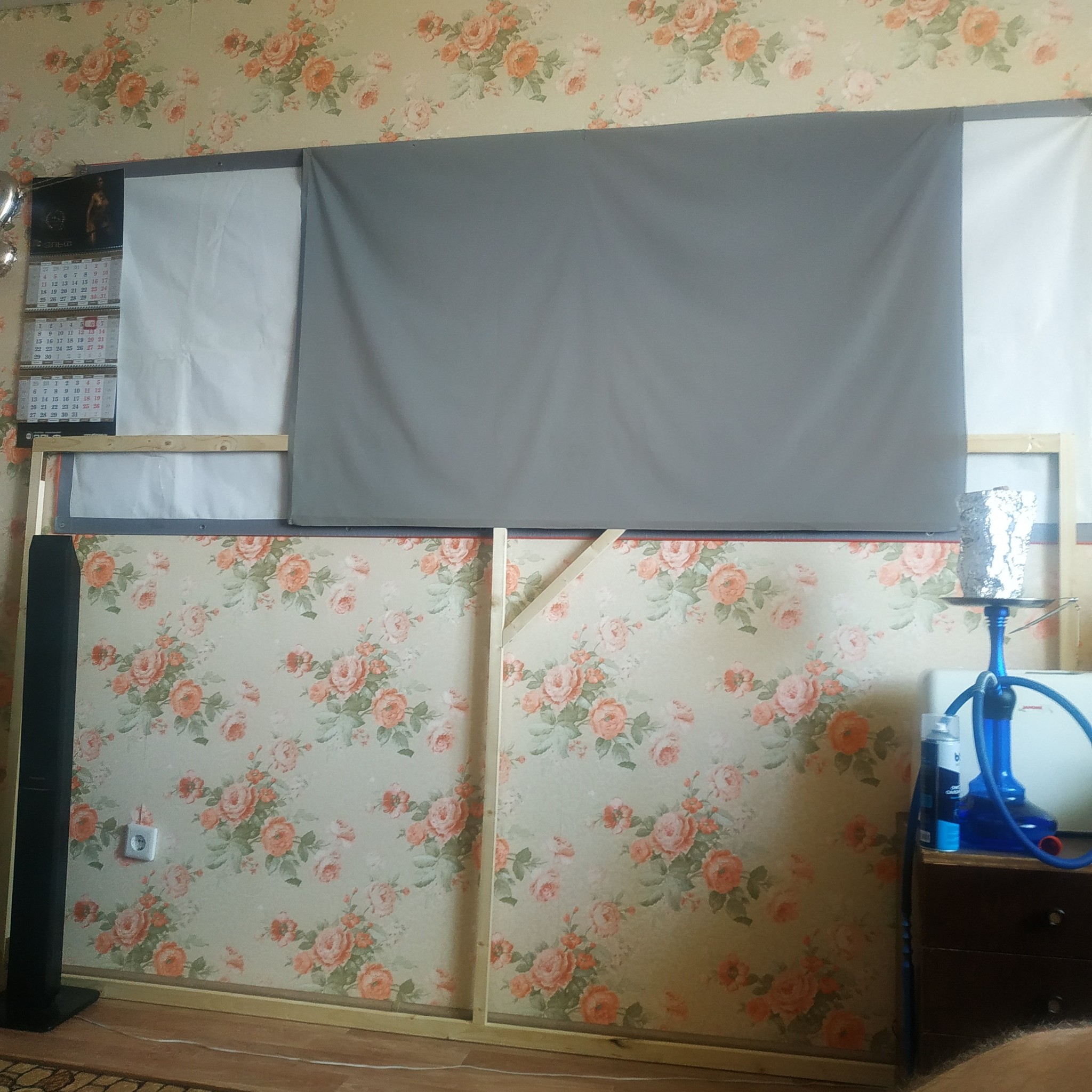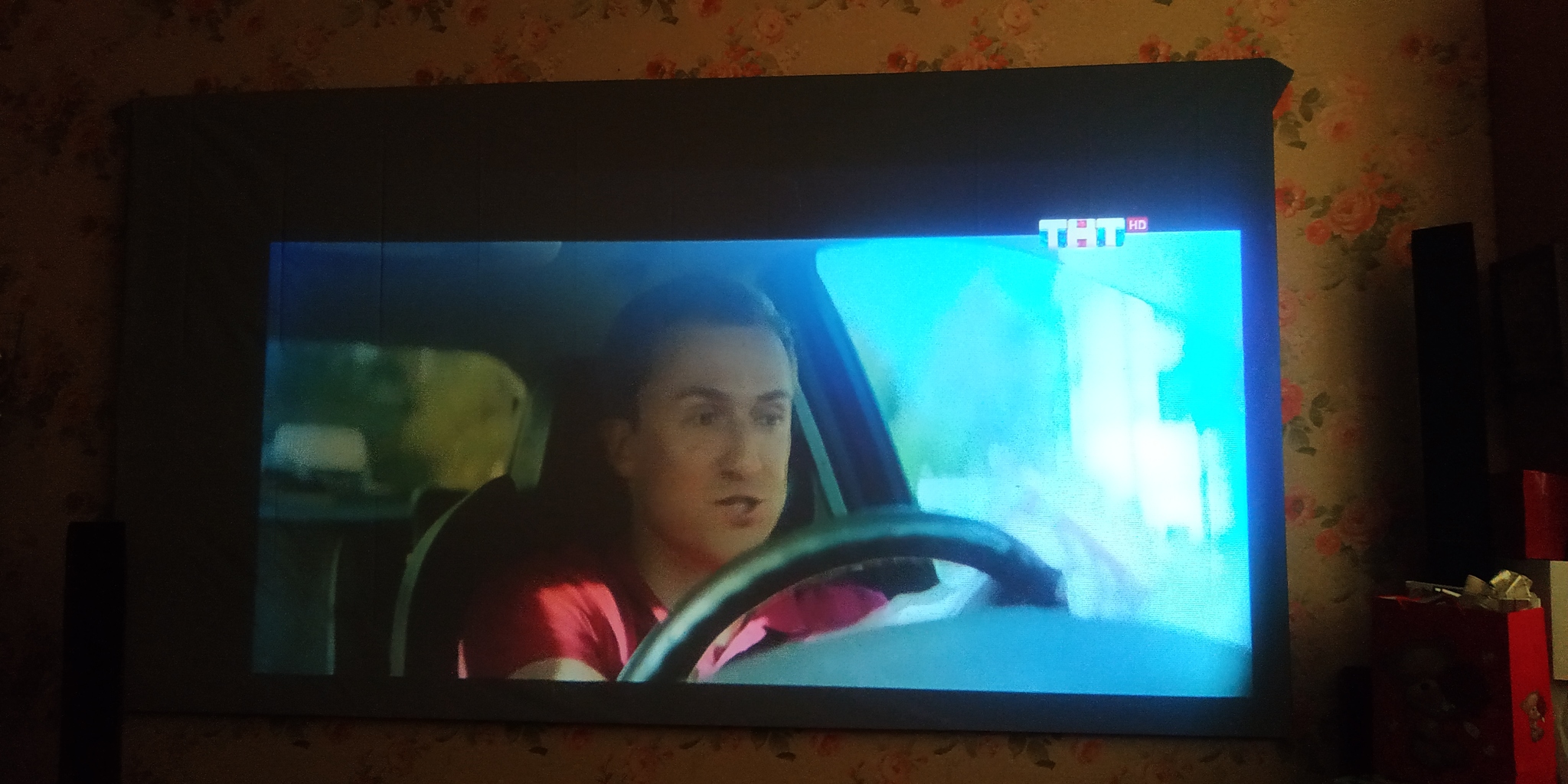 Время шло, мы смотрели фильмы на обычном баннере. На нем были складки, которые не разгладить, он бликовал (не сильно), но нас все устраивало.