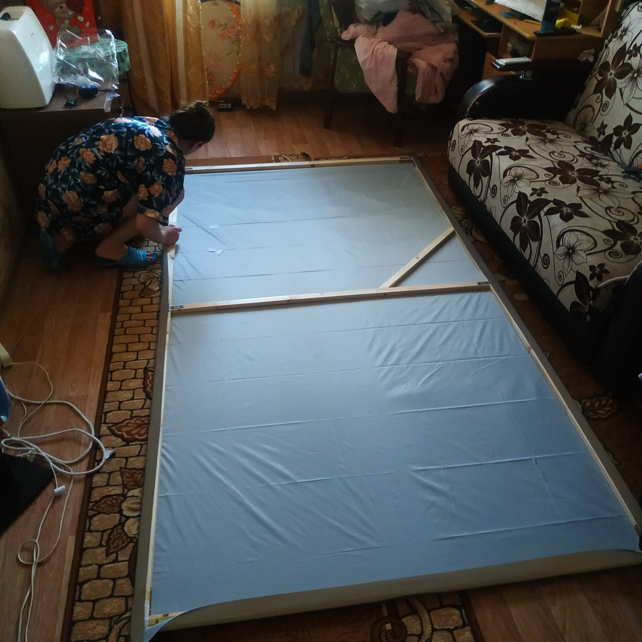 Далее пришел экран (за 2-3 недели), в комплекте были липучки на двустороннем скотче, одна половина на раму, вторая на экран. Так собственно и крепил, мне понравилось, есть возможность в любой момент поправить или натянуть экран.
