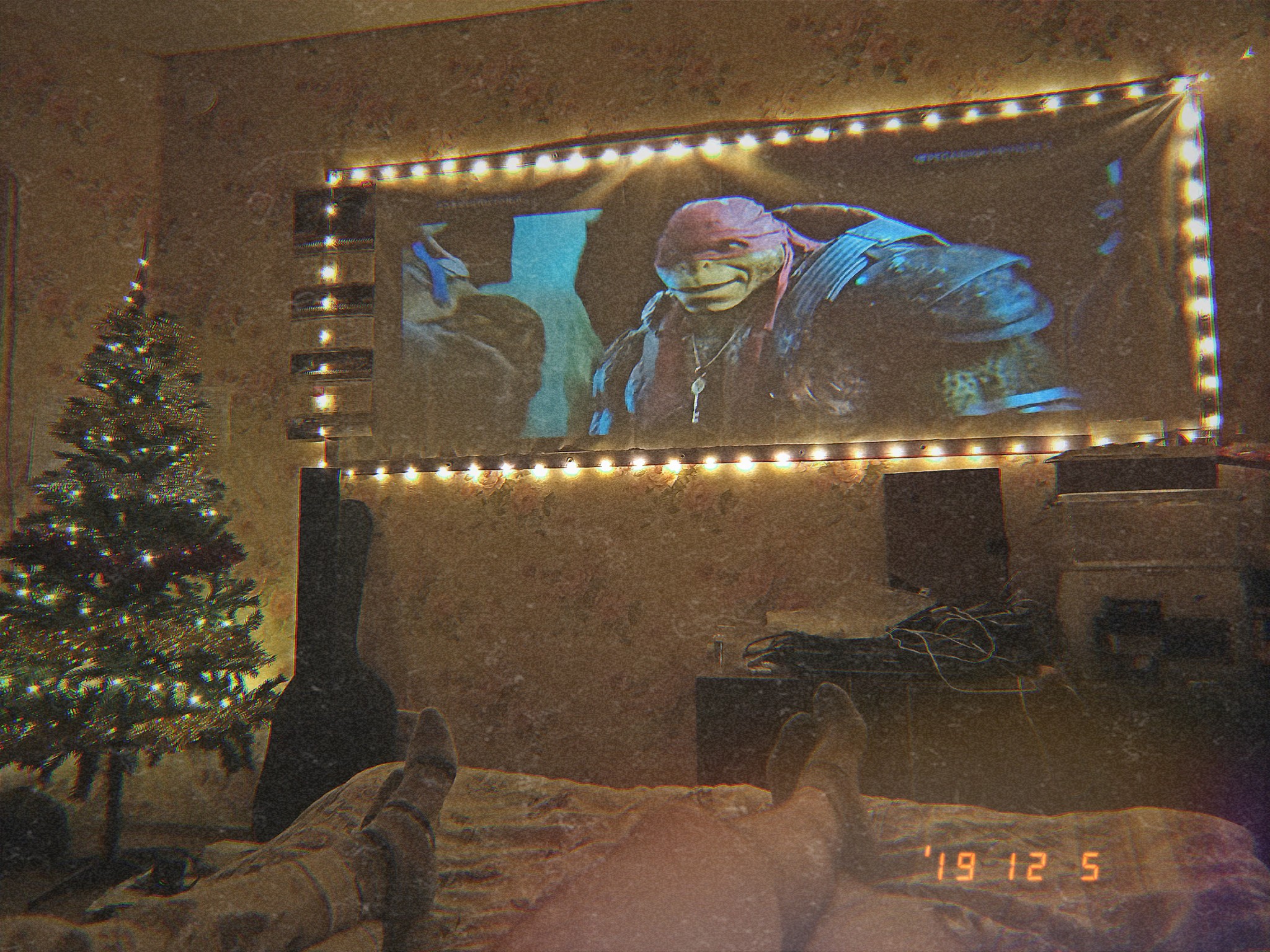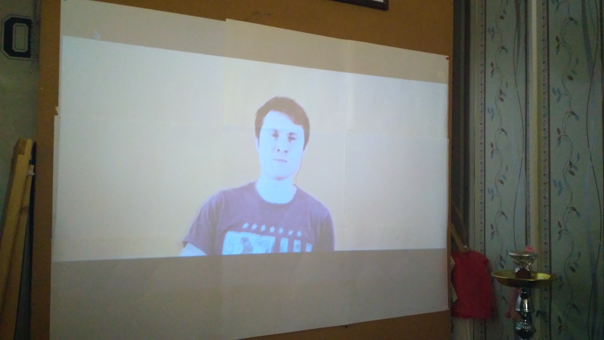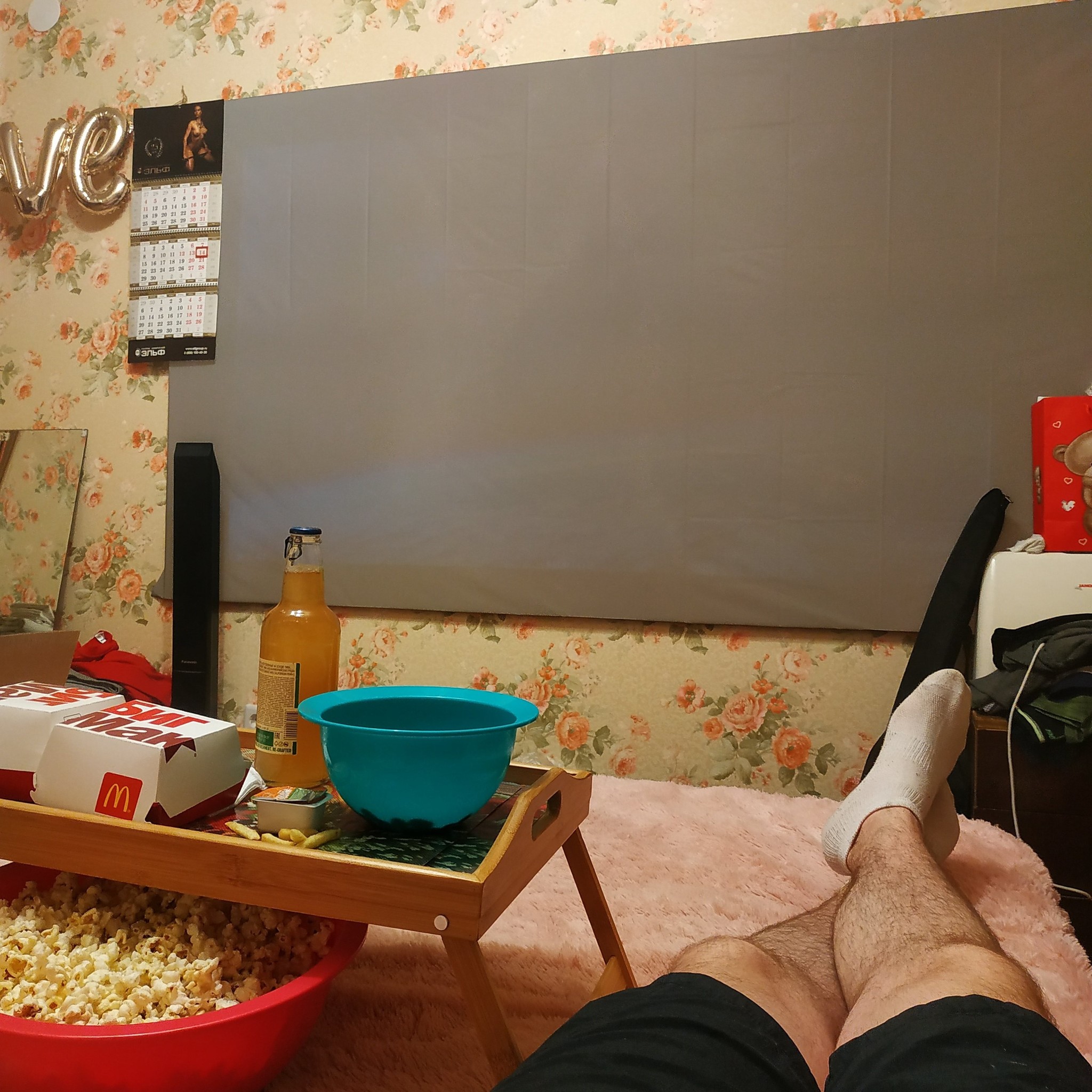 Спустя время общажная жизнь кончилась, нужно было как-то размещать это действо в съемной квартире. В этот раз пилить экран из бумаги не хотелось, а денег на хороший экран по прежнему нет. За разговором с отцом выяснил, что у него имеется не нужный баннер с белой обратной стороной. То, что нужно! Подумал я, но увы смотреть на нем можно было лишь кинцо в формате 16:9. Ну хоть так :) Вечера становились особенно уютными. Кстати свет от гирлянды практически не влиял на изображение, но все же лучше без него.