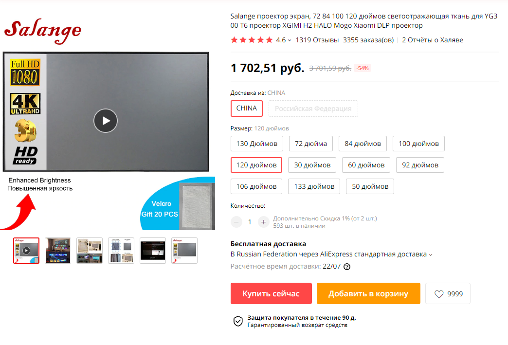 Выбор пал на него, 120 дюймов (ниче такой телик, правда?) или 266*148см.