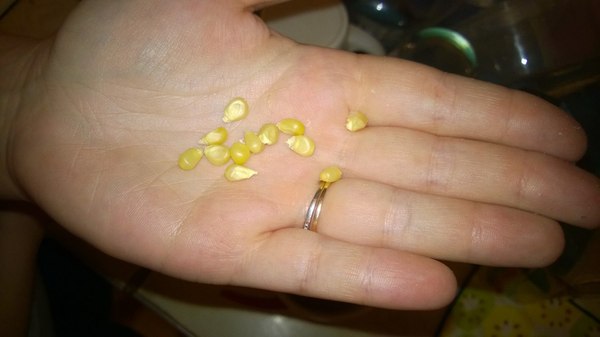 Для попкорна используется специальная кукуруза - "взрывающаяся". Отделяем зернышки от "ствола". Сами зернышки выглядят вот так.