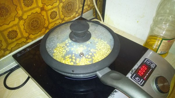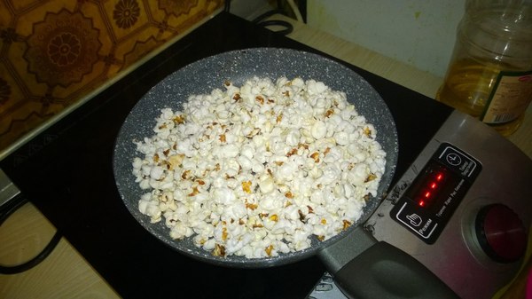 засыпаем не много, т.к. когда они полопаются, то попкорна будет много. Закрываем крышкой, желательно быстро, иначе все будет летать по кухне.