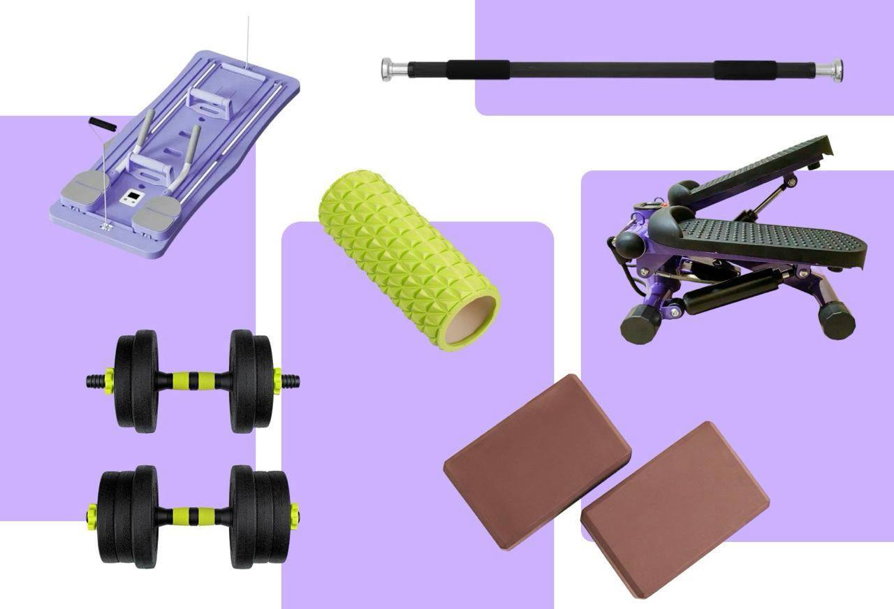 Универсальный набор легко уместится в шкафу и подойдет для разных форматов занятий. Обычно достаточно резинок или эспандеров, разборных гантелей, утяжелителей, а также аксессуаров для растяжки и йоги — валиков или опорных блоков. Можно приобрести степпер или многофункциональную платформу-реформер для пилатеса