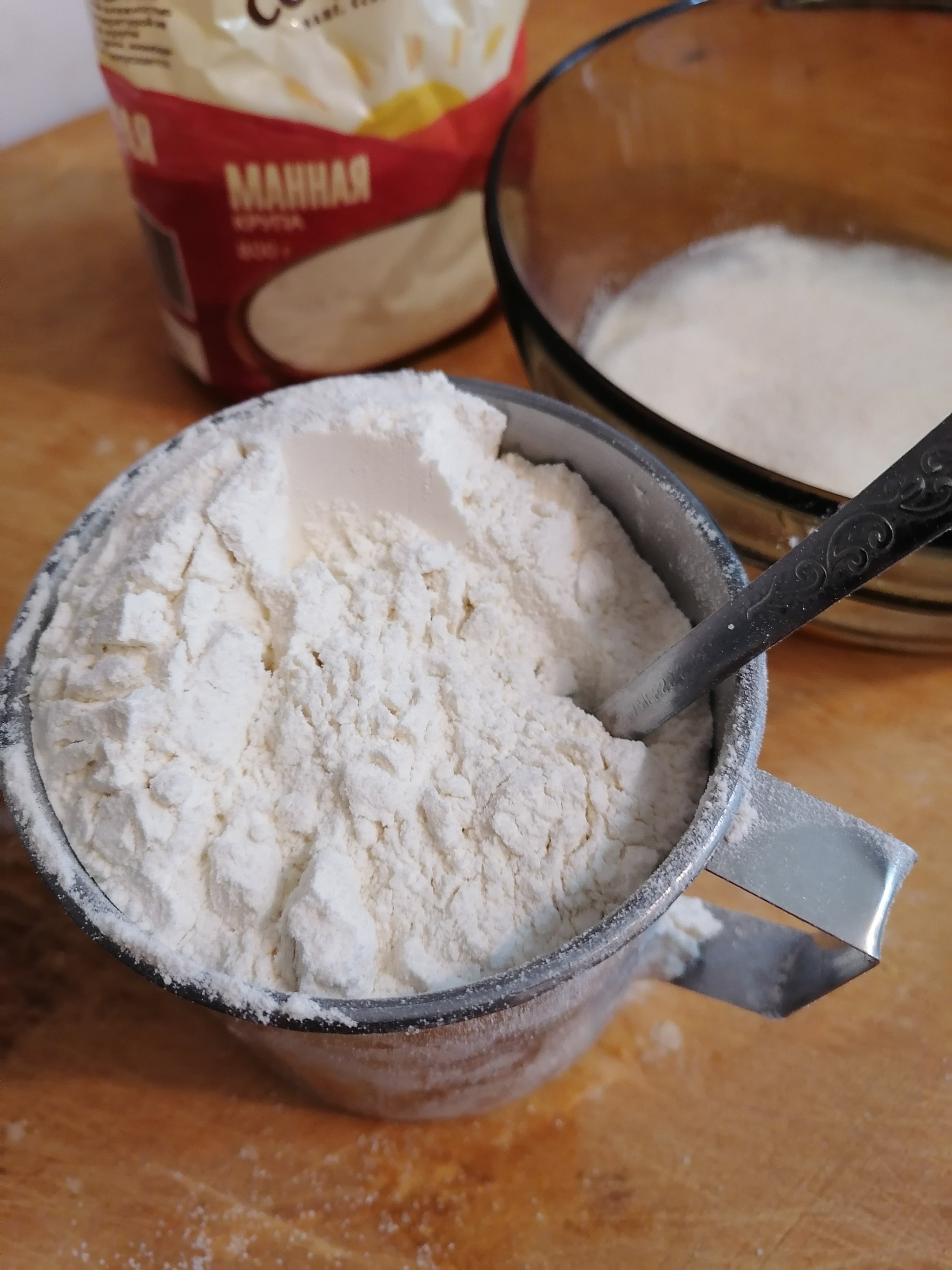 Манки один к одному с мукой. То биш столько же, сколько и муки. В плане... не нужно выдерживать жёсткой грамовки. Делаем всё на глазок, с душой.