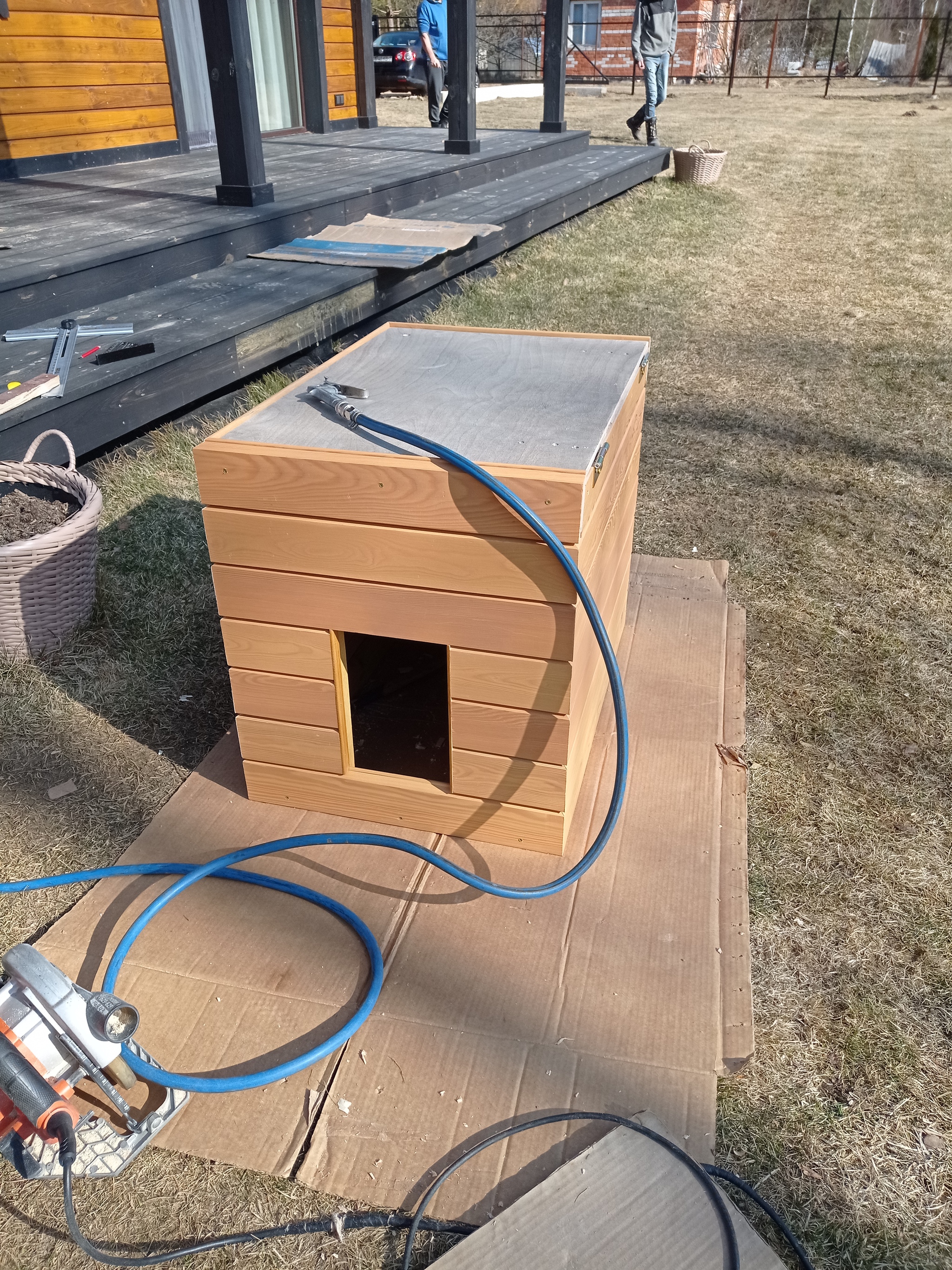 Заканчиваем "обшивку", вырезаем вход и делаем крышку из фанеры десятки ,верхний ряд доски поднимается над каркасом примерно на 12 мм ,что бы крышка утапливалась .