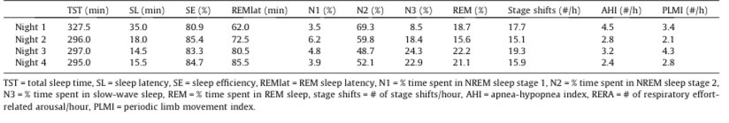 Характеристики PSG (полисомнография) в первую ночь показаны в таблице 1.