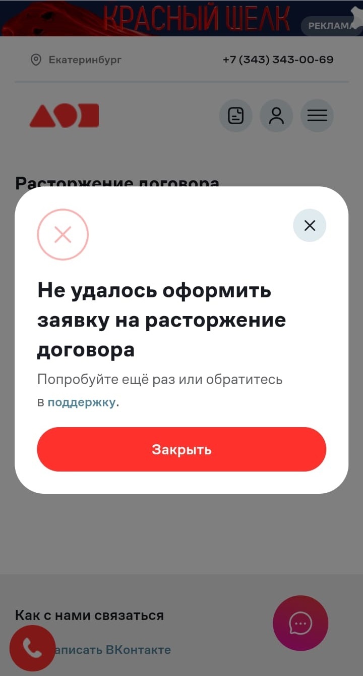 При нажатии кнопки продолжить приходит уведомление о невозможности расторжения договора