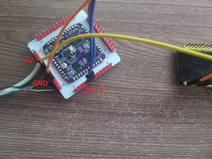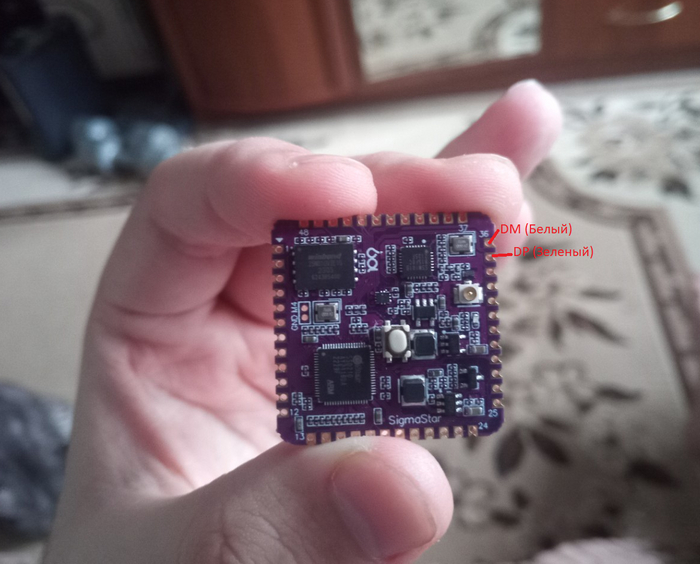 Поскольку на плате не разведен разъем USB, для прошивки нужно распустить нерабочий кабель для зарядки смартфона, либо купить внешний USB-разъем на плате. VBUS кидаем на вход питания, белый провод на DM-, зелёный на DM+. Не забывайте провести общую землю между UART-преобразователем и основным питанием платы, дабы не потерять логи.