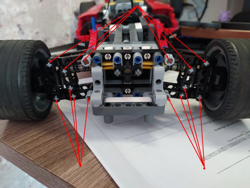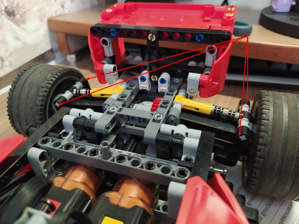 Для этого я решил укрепить конструкцию подвески. Так как детали конструктора предназначены для процесса сборки и разборки, то постоянная тряска и удары, приходящиеся на детали переднего и заднего моста могут привести к их расшатыванию. Чтобы такого не произошло я аккуратно разобрал облицовку гоночного автомобиля, чтобы иметь свободный доступ к механизму: