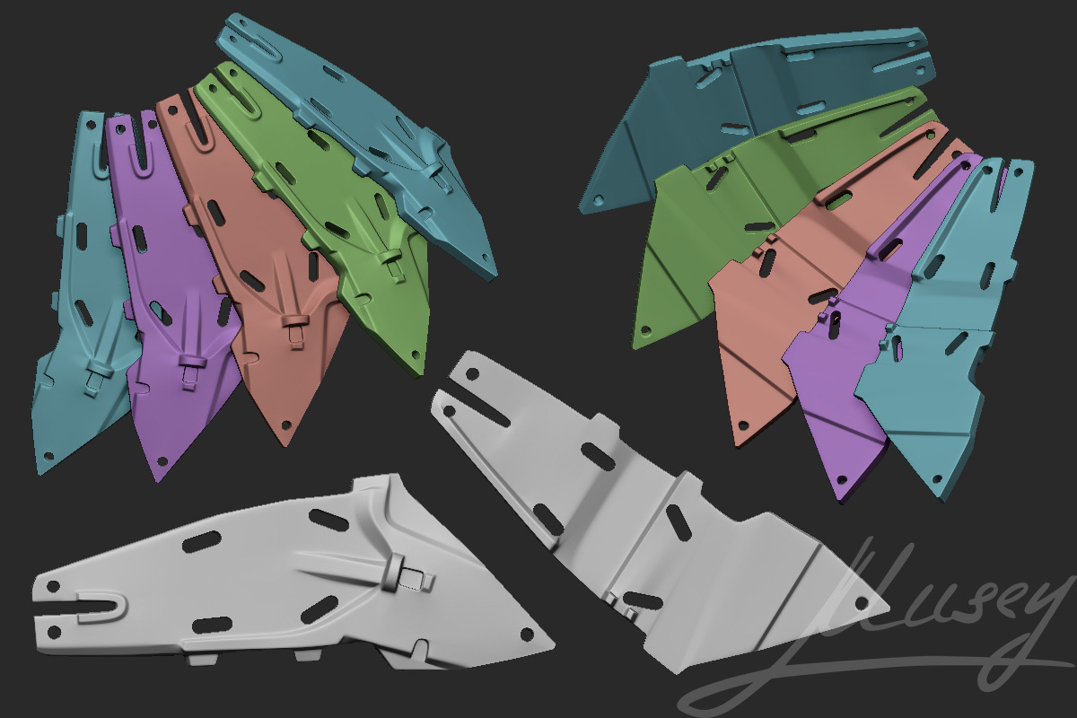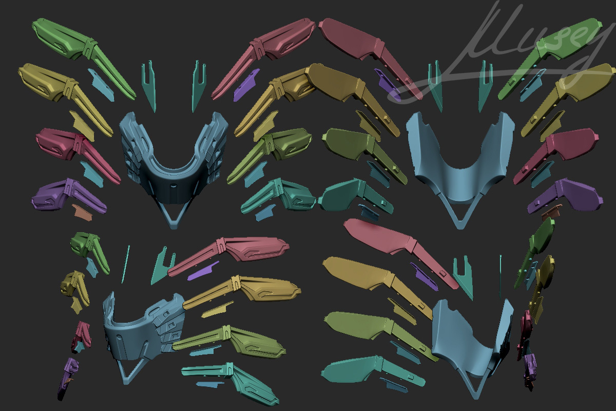 Особенно интересным оказался элемент брони на голове. Он выполнен из нескольких частей для удобства печати. Я предусмотрел посадочные места и пазы для точного позиционирования, а также сделал выборки под ленточки, чтобы все детали прилегали максимально плотно.