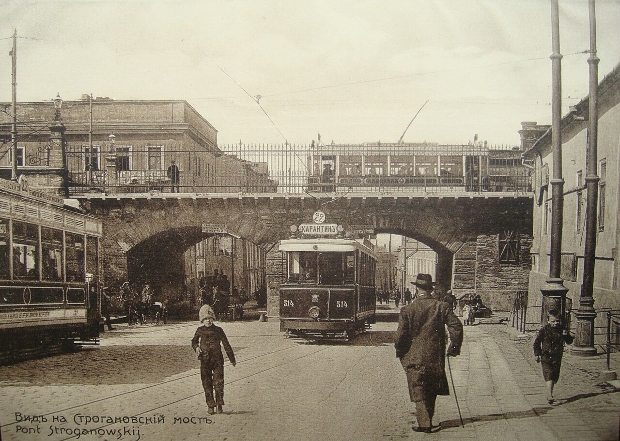 Трамвай показался на мосту, желто-красный, со стеклянным тамбуром впереди — шедший довольно скоро, но далеко не так, как мы себе представляли. Под наши крики он прошел мимо нас с тамбуром, наполненным людьми, среди которых был и какой-то высокопоставленный священник, кропивший перед собой водой, также градоначальник Толмачев в очках и с рыжеватыми усами. За управлением стоял господин в котелке, и все произносили его имя: