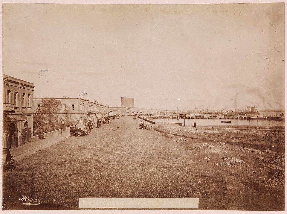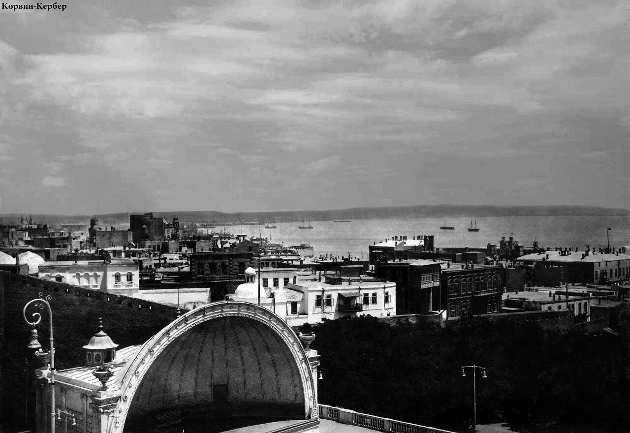 28-го мая на горизонте впервые открылось нашим взорам Каспийское море. При въезде в Баку нас встретил чиновник, состоящий при городском голове, и от города предложил всему дивизиону баранов, хлеба и по чарке водки, что, разумеется, было принято с восторгом и благодарностью. Место для бивака около самого города было очень удобное, так как находилось близко от воды и было совершенно ровное, только ветры заносили все наши вещи слоем пыли и песка. Пыль есть вообще одно из неудобств летней жизни в Баку, хотя и стараются ослабить ее поливкою улиц города нефтью. Полное отсутствие какой-либо растительности как в Баку, так и в его окрестностях и вследствие этого недостаток тени заставляет бакинцев, имеющих на то какую-нибудь возможность, искать спасения от летних сильных жаров в бегстве в Ленкорань или в другие, более сносные для жительства в летнее время места. Так называемый губернаторский сад, в котором по воскресеньям и праздникам играет военная музыка каспийской флотилии, есть единственный пункт, куда стекаются бакинцы по вечерам, подышать более чистым, чем на улицах, воздухом, или же для более прозаических целей. Сад этот еще совсем молодой и разведен по инициативе много способствовавшего устройству и украшению Баку бывшего бакинского губернатора, не так давно умершего, генерала М. П. Колюбакина, который, между прочим, зная, насколько бакинская почва неспособна к разведению на ней древесных пород, с целью устройства городского сада, выписал из Ленкорани землю, перевезенную оттуда на пароходах, и, действительно, оказалось, что на ней принялись посаженные растения, немедленно погибавшие на бакинской почве. Воспоминания о Баку 1879 года. Как жил город? Вообще Баку производит на путешественников приятное впечатление и бесспорно может считаться одним из лучших и красивейших городов Кавказа, притом еще города обстраивающегося и украшающегося с каждым днем. Прекрасная набережная, сплошь отделанная плитами из тесаного камня, обстроена большими каменными домами, с балконов и окон которых взорам открывается море с пристанью и находящимися на ней пароходами, барками и судами самых разнообразных типов. Усиленная деятельность, кипучая жизнь, присущая каждому портовому городу, в Баку еще рельефнее обрисовываются, вследствие импульса, данного его торговле нефтяными богатствами окрестностей.