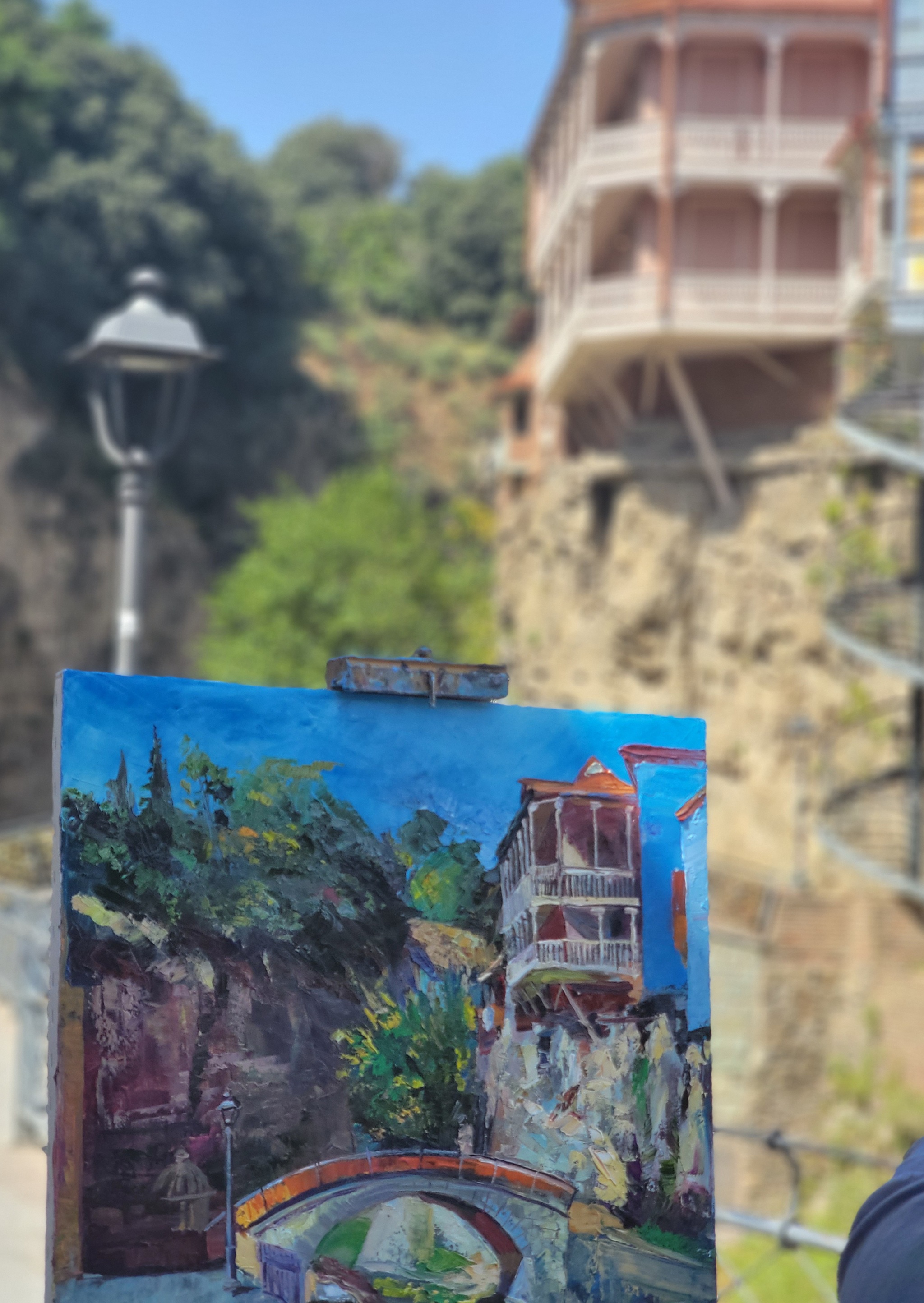13 entonee Дорога к водопаду 3 года назад После серных бань в Тбилиси есть очень живописные места около водопада.Фото сделано мной час назад с разрешения художника. [моё] Грузия Дерево Тбилиси Картина Художник Художество Здание Ещё 0