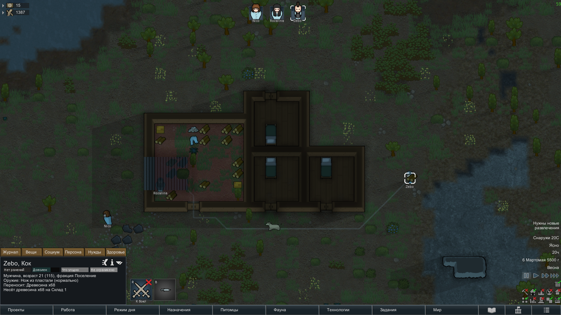 Перво-наперво обозначаю зону складирования размером 15х15 и обношу ее стеной. Склад - это сердце будущего поселения, а хранящиеся на нем ништяки - его кровь, так что спать и жрать мои колонисты первое время будут на земле. Лишь когда к вечеру склад почти закончен и все наши хабары перекочевали в его недра, поселенцы получают команду на возведения первого жилого блока из четырех просторных квадратных комнат, естественно нифига не успевают и валятся спать где попало.