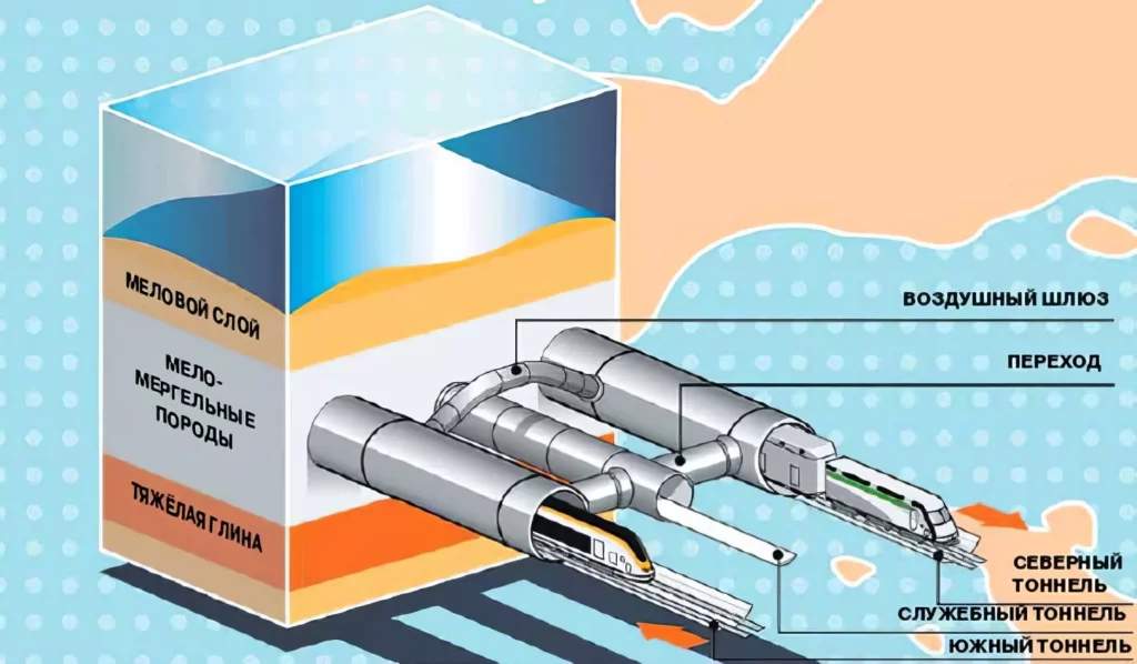 Глубина залегания тоннелей составила 45 метров под морским дном. Такая цифра объяснялась тем, что на этой глубине в земле был меловой геологический слой – очень легкий для проходки и в то же время непроницаемый для воды.