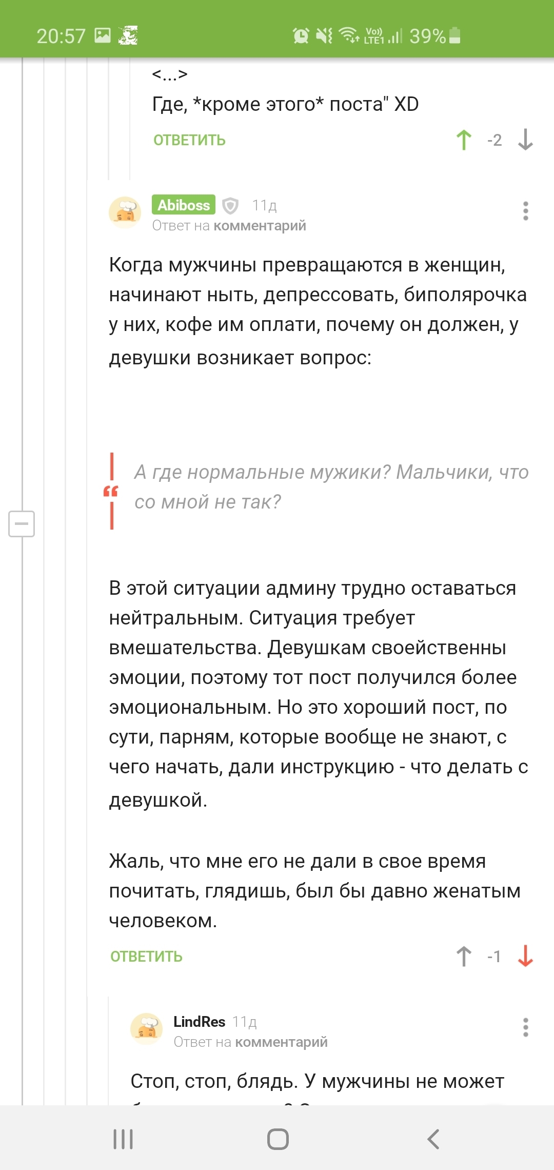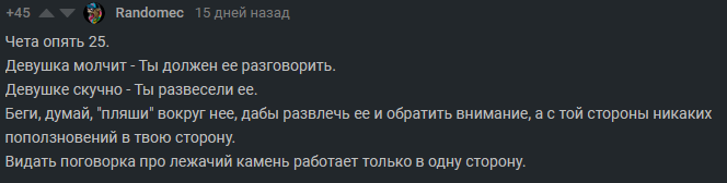 Но откуда могли взяться подобные жизненные установки? Думается, обозначенные выше мужчины про отношения с девушками читали только в интернете. Оставим в стороне вопрос, как юноши, достигнув почтенного возраста, так и не достигли зрелости - у каждого для этого найдется тысяча причин, и все, вероятно, будут очень разными. Их оправдания полагаю никому не интересными.