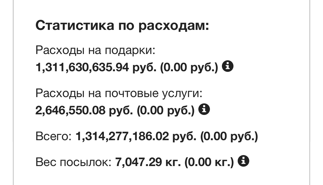 Не знаю на сколько можно доверять статистике, но простая калькуляция показывает, что в среднем 1кг подарка стоит около 180тыр.