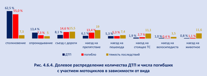 Наиболее распространенным видом ДТП с участием мотоциклов является столкновение. На них приходится почти две трети (62,5%, или 5 634) от общего количества происшествий и более половины (55%, или 490) от общего числа погибших. Вторым по массовости видом ДТП с участием мотоциклов является опрокидывание (13,4%, или 1 206 ДТП). В силу низкого уровня пассивной безопасности мотоциклов по сравнению с другими ТС высокими значениями тяжести последствий характеризуются наезд на препятствие (19), съезд с дороги (15,5), наезд на животное (11,6), наезд на стоящее ТС (11,1), (рис. 4.6.4).