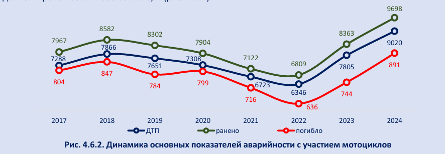 В 2024 году отмечен значительный рост всех основных показателей аварийности с участием мотоциклов. Количество ДТП увеличилось на 15,6% (9 020), число погибших – на 19,8% (891), раненых – на 16% (9 698). Рост всех основных показателей продолжается второй год подряд. Тяжесть последствий данных происшествий составила 8,4. (рис. 4.6.2).