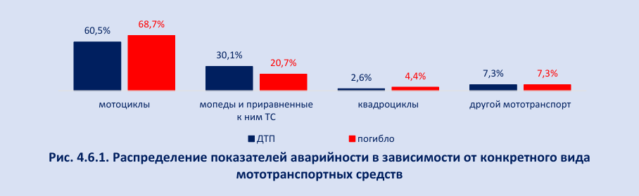 В 2024 году отмечен значительный рост всех основных показателей аварийности с участием мототранспорта. Количество ДТП увеличилось на 17,8% (14 906), число погибших – на 22,2% (1 297), раненых – на 18,2% (16 088). Рост всех основных показателей продолжается второй год подряд. Почти две трети (60,5%) из всех ДТП с участием мототранспорта приходится на происшествия с участием мотоциклов, при этом доля погибших в них несколько выше – 68,7%. Чуть менее трети (30,1%) приходится на происшествия с участием мопедов и приравненные к ним ТС, однако доля погибших в них ниже – 20,7% (рис. 4.6.1).