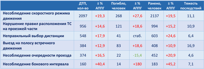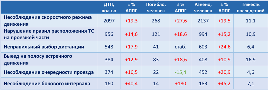 В 2024 году зафиксирован значительный рост аварийности из-за нарушений ПДД водителями мотоциклов. Количество ДТП увеличилось на 19,2% (5 068), число погибших и раненых – на 22,6 и 19,7% (586 и 5 382 соответственно). Водители мотоциклов были виновны более чем в половине случаев (56,2%). Тяжесть последствий составляет 9,8. Наиболее распространенными нарушениями ПДД, допускаемыми водителями мотоциклов и ставшими непосредственной причиной ДТП, являются несоблюдение скоростного режима движения (41,4%, или 2 097), нарушение правил расположения ТС на проезжей части (18,8%, или 956), неправильный выбор дистанции (10,8%, или 548), выезд на полосу встречного движения (7,6%, или 384), несоблюдение очередности проезда (7,4%, или 374), несоблюдение бокового интервала (3,2%, или 160). ДТП, произошедшие из-за выезда на полосу встречного движения, характеризуются высокой тяжестью последствий (16,9) (табл. 4.6.1).