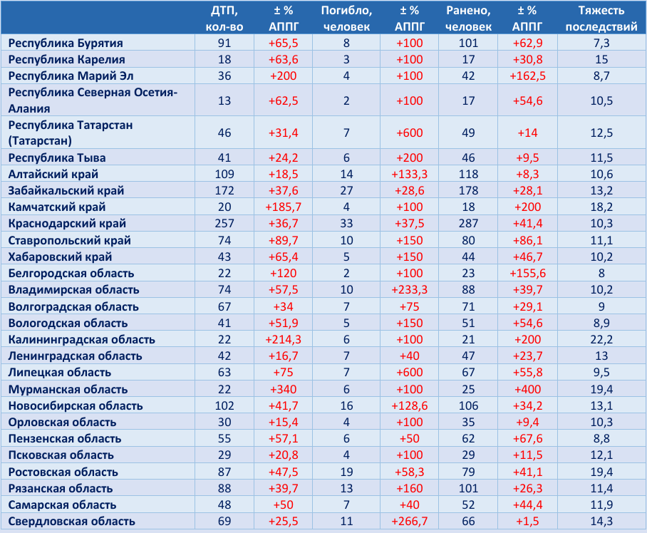 Большая часть ДТП с участием мотоциклов зафиксирована в НП (84,5%, или 7 620), на них приходится более двух третей (69,8% или 622) погибших. Вне НП произошло 15,5% (1 400) ДТП, однако доля погибших значительно больше и составляет почти треть (30,2%, 269). Тяжесть последствий ДТП вне НП (15,7) более чем в два раза выше, чем в НП (7). Значительный рост всех показателей зафиксирован в НП, количество ДТП увеличилось на 16%, число погибших – на 23,7% и раненых – на 16,5%. Вне НП также отмечено увеличение количества ДТП – на 13,1%, числа погибших – на 11,6%, раненых – на 12,8%.
